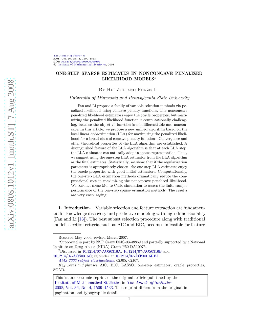 Fan and Li propose a family of variable selection methods via penalized likelihood using concave penalty functions. The nonconcave penalized likelihood estimators enjoy the oracle properties, but maximizing the penalized likelihood function is computationally challenging, because the objective function is nondifferentiable and nonconcave. In this article, we propose a new unified algorithm based on the local linear approximation (LLA) for maximizing the penalized likelihood for a broad class of concave penalty functions. Convergence and other theoretical properties of the LLA algorithm are established. A distinguished feature of the LLA algorithm is that at each LLA step, the LLA estimator can naturally adopt a sparse representation. Thus, we suggest using the one-step LLA estimator from the LLA algorithm as the final estimates. Statistically, we show that if the regularization parameter is appropriately chosen, the one-step LLA estimates enjoy the oracle properties with good initial estimators. Computationally, the one-step LLA estimation methods dramatically reduce the computational cost in maximizing the nonconcave penalized likelihood. We conduct some Monte Carlo simulation to assess the finite sample performance of the one-step sparse estimation methods. The results are very encouraging.
