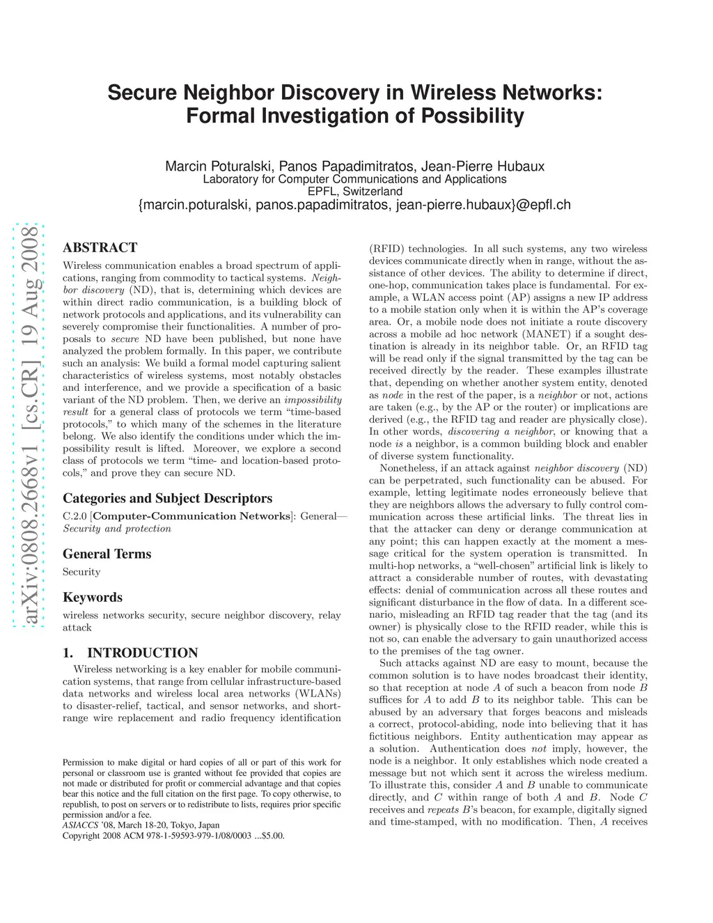 Wireless communication enables a broad spectrum of applications, ranging from commodity to tactical systems. Neighbor discovery (ND), that is, determining which devices are within direct radio communication, is a building block of network protocols and applications, and its vulnerability can severely compromise their functionalities. A number of proposals to secure ND have been published, but none have analyzed the problem formally. In this paper, we contribute such an analysis: We build a formal model capturing salient characteristics of wireless systems, most notably obstacles and interference, and we provide a specification of a basic variant of the ND problem. Then, we derive an impossibility result for a general class of protocols we term "time-based protocols," to which many of the schemes in the literature belong. We also identify the conditions under which the impossibility result is lifted. Moreover, we explore a second class of protocols we term "time- and location-based protocols," and prove they can secure ND.