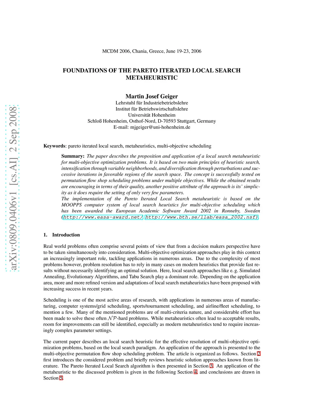 The paper describes the proposition and application of a local search metaheuristic for multi-objective optimization problems. It is based on two main principles of heuristic search, intensification through variable neighborhoods, and diversification through perturbations and successive iterations in favorable regions of the search space. The concept is successfully tested on permutation flow shop scheduling problems under multiple objectives. While the obtained results are encouraging in terms of their quality, another positive attribute of the approach is its' simplicity as it does require the setting of only very few parameters. The implementation of the Pareto Iterated Local Search metaheuristic is based on the MOOPPS computer system of local search heuristics for multi-objective scheduling which has been awarded the European Academic Software Award 2002 in Ronneby, Sweden (http://www.easa-award.net/, http://www.bth.se/llab/easa_2002.nsf)