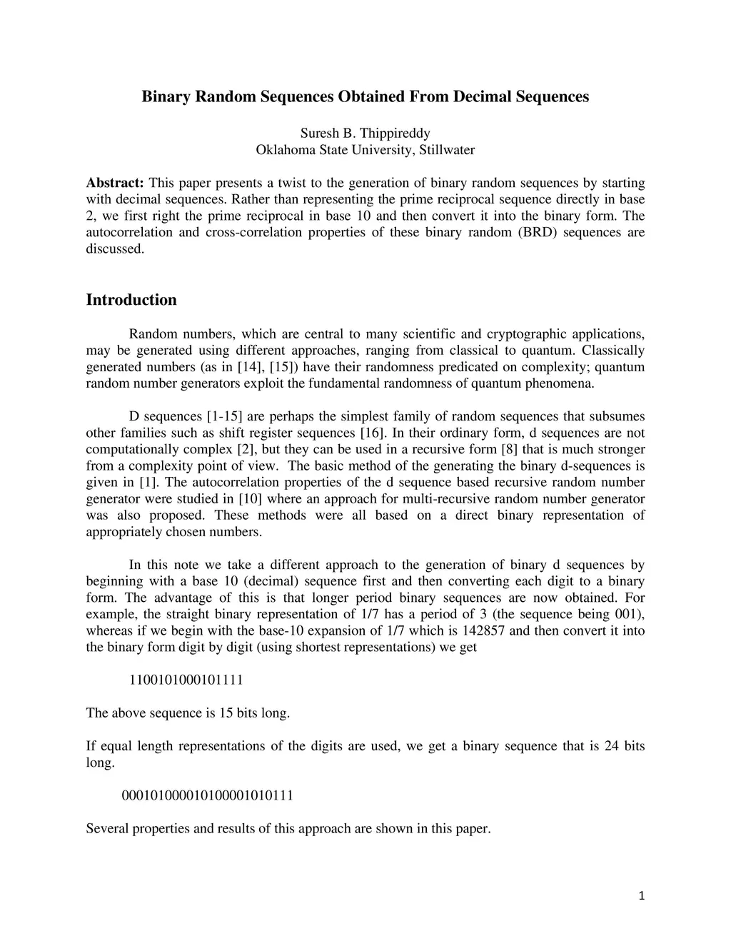 This paper presents a twist to the generation of binary random sequences by starting with decimal sequences. Rather than representing the prime reciprocal sequence directly in base 2, we first right the prime reciprocal in base 10 and then convert it into the binary form. The autocorrelation and cross-correlation properties of these binary random (BRD) sequences are discussed.