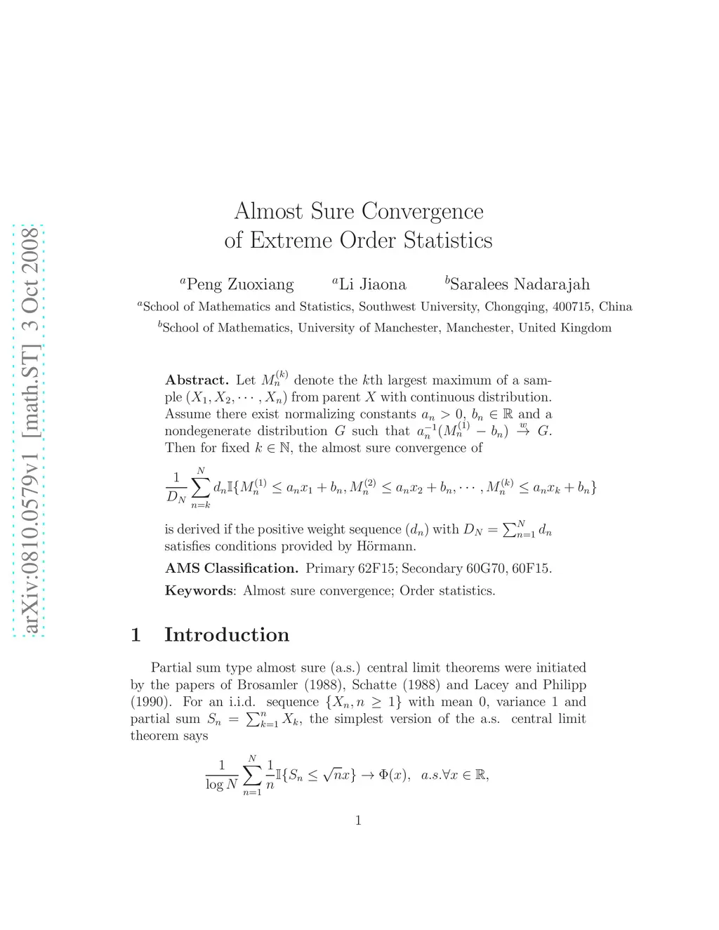Almost Sure Convergence of Extreme Order Statistics