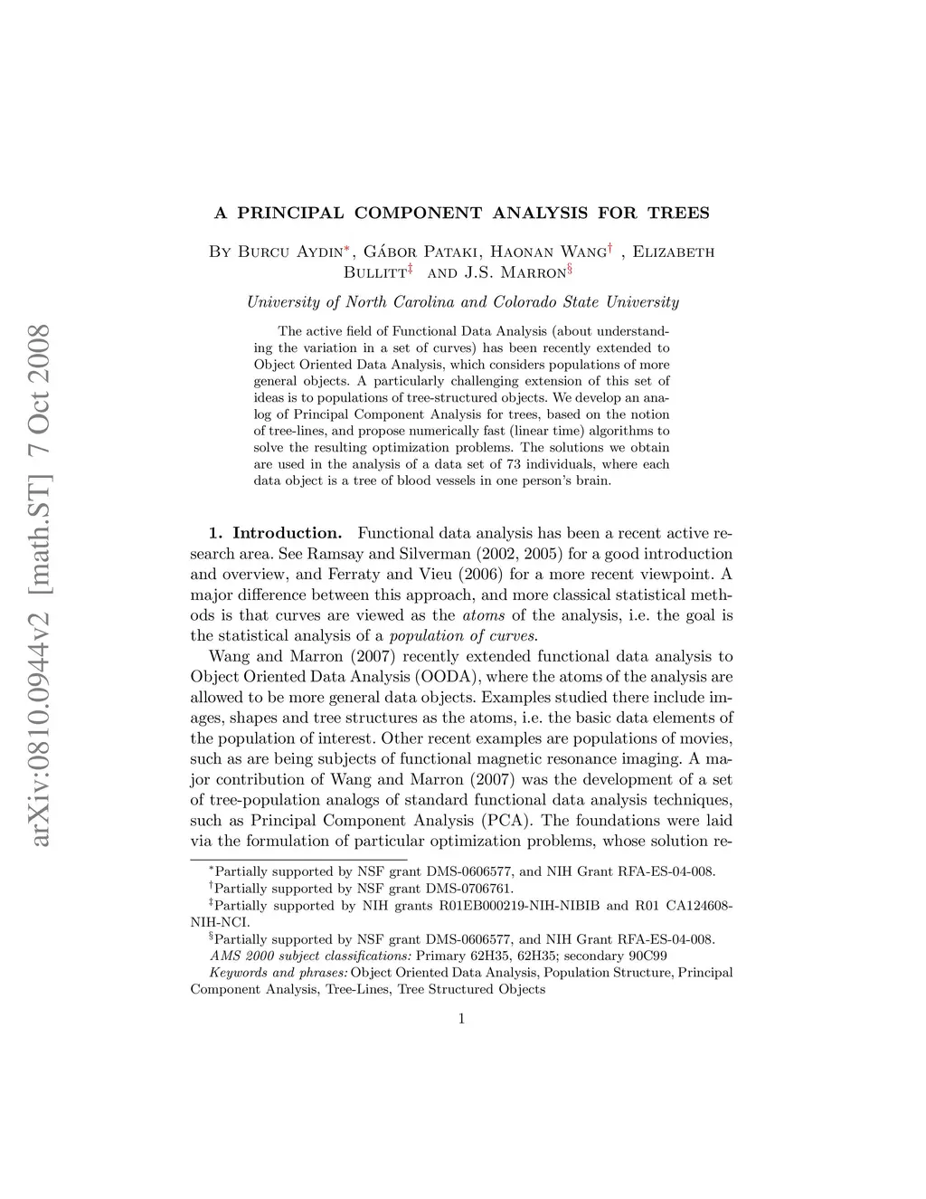 The active field of Functional Data Analysis (about understanding the variation in a set of curves) has been recently extended to Object Oriented Data Analysis, which considers populations of more general objects. A particularly challenging extension of this set of ideas is to populations of tree-structured objects. We develop an analog of Principal Component Analysis for trees, based on the notion of tree-lines, and propose numerically fast (linear time) algorithms to solve the resulting optimization problems. The solutions we obtain are used in the analysis of a data set of 73 individuals, where each data object is a tree of blood vessels in one person's brain.