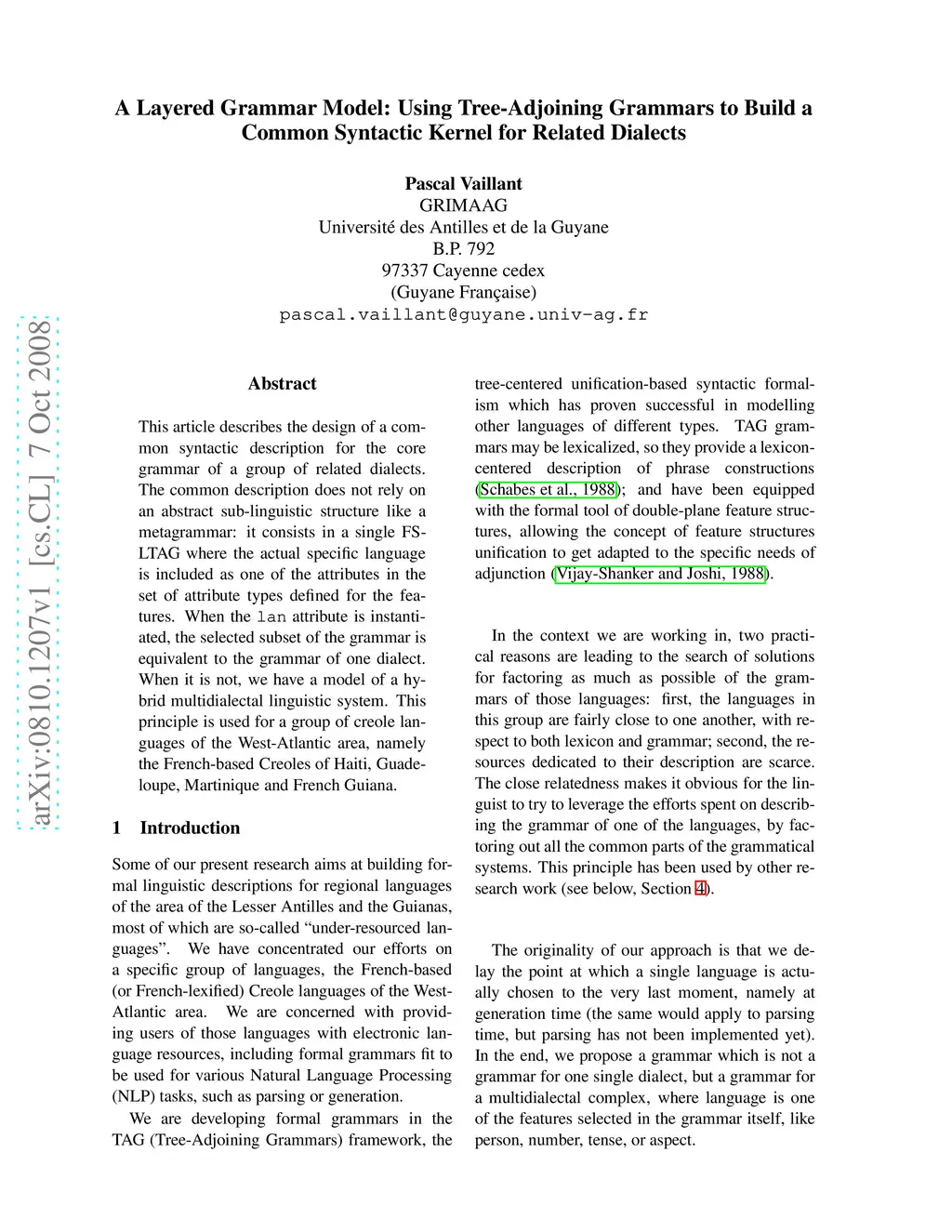 This article describes the design of a common syntactic description for the core grammar of a group of related dialects. The common description does not rely on an abstract sub-linguistic structure like a metagrammar: it consists in a single FS-LTAG where the actual specific language is included as one of the attributes in the set of attribute types defined for the features. When the lang attribute is instantiated, the selected subset of the grammar is equivalent to the grammar of one dialect. When it is not, we have a model of a hybrid multidialectal linguistic system. This principle is used for a group of creole languages of the West-Atlantic area, namely the French-based Creoles of Haiti, Guadeloupe, Martinique and French Guiana.