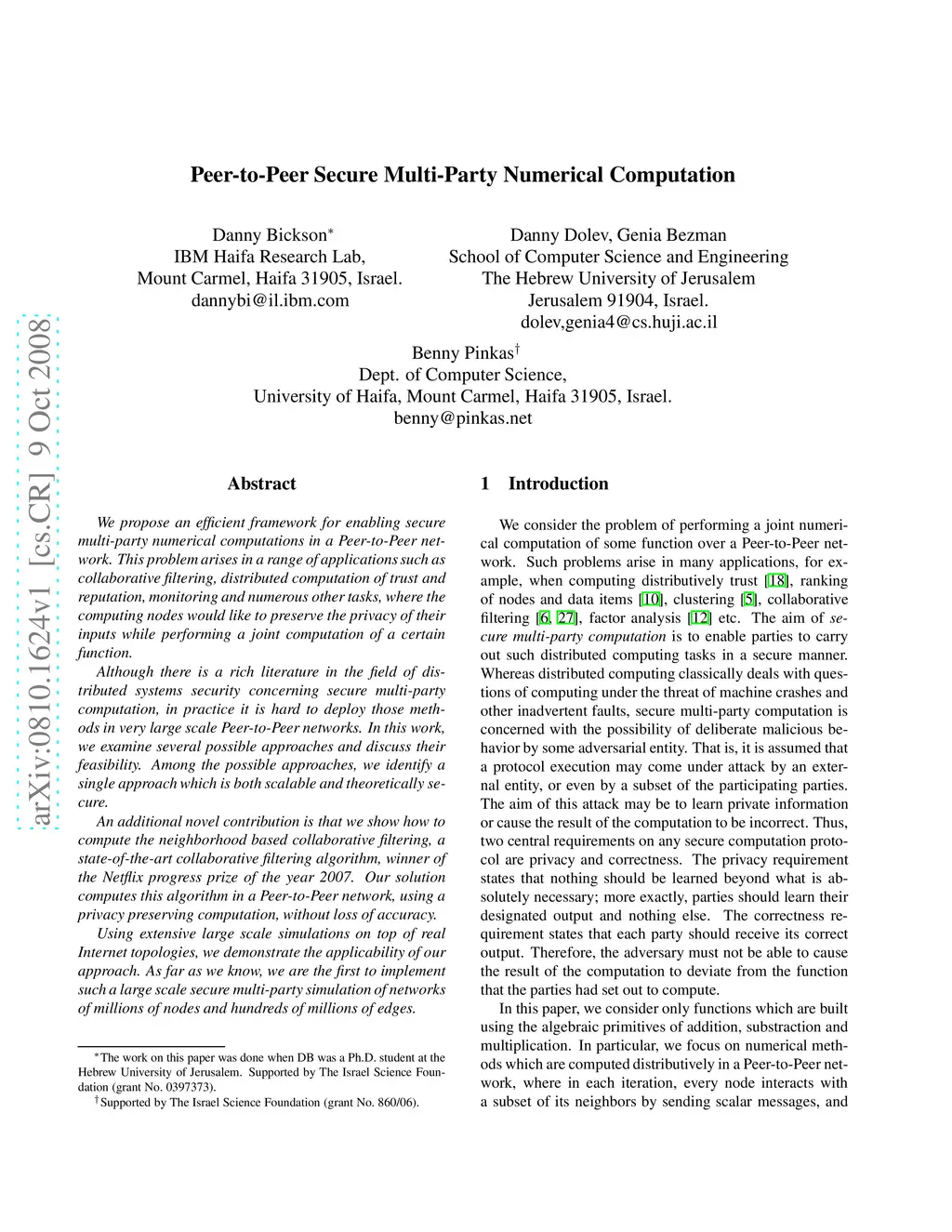 Peer-to-Peer Secure Multi-Party Numerical Computation