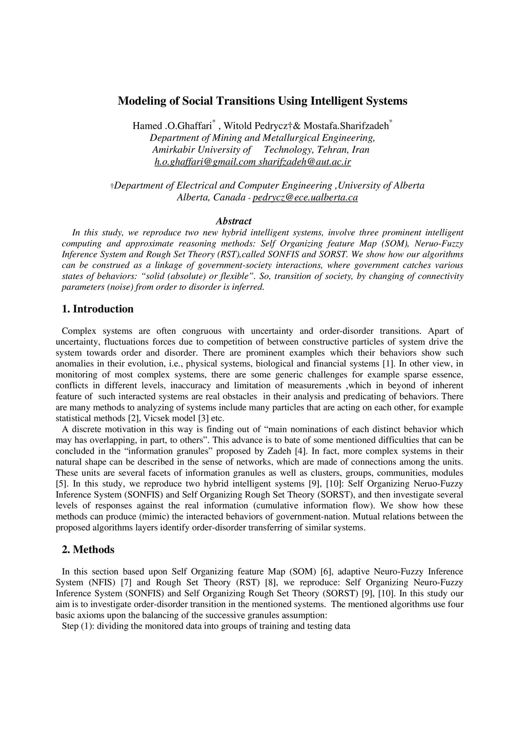 In this study, we reproduce two new hybrid intelligent systems, involve three prominent intelligent computing and approximate reasoning methods: Self Organizing feature Map (SOM), Neruo-Fuzzy Inference System and Rough Set Theory (RST),called SONFIS and SORST. We show how our algorithms can be construed as a linkage of government-society interactions, where government catches various states of behaviors: solid (absolute) or flexible. So, transition of society, by changing of connectivity parameters (noise) from order to disorder is inferred.