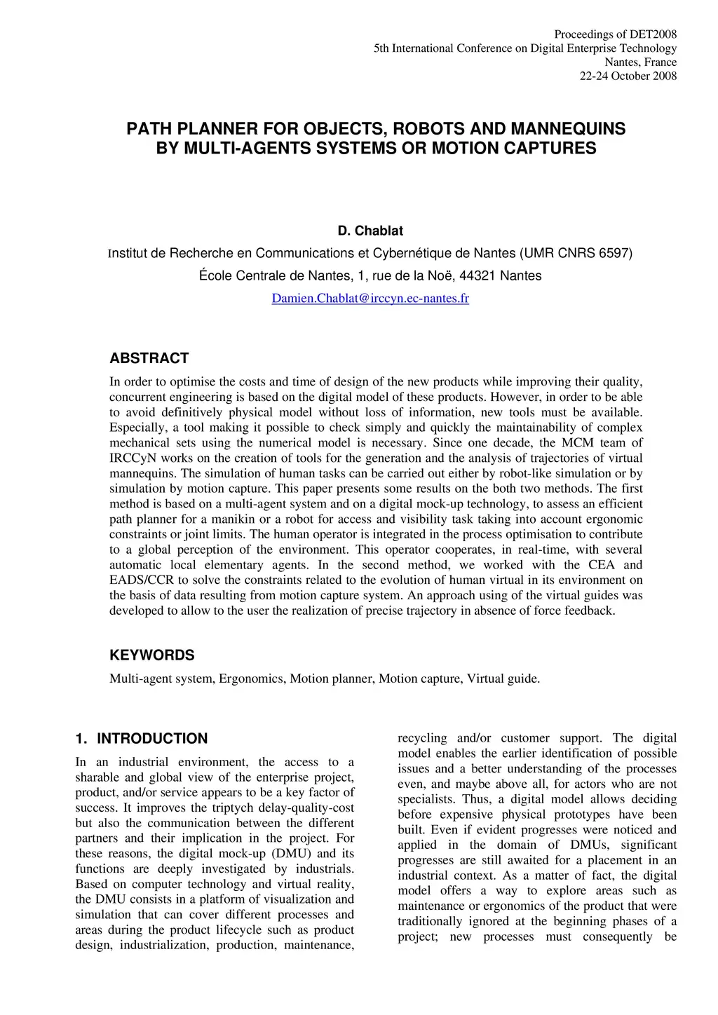 In order to optimise the costs and time of design of the new products while improving their quality, concurrent engineering is based on the digital model of these products. However, in order to be able to avoid definitively physical model without loss of information, new tools must be available. Especially, a tool making it possible to check simply and quickly the maintainability of complex mechanical sets using the numerical model is necessary. Since one decade, the MCM team of IRCCyN works on the creation of tools for the generation and the analysis of trajectories of virtual mannequins. The simulation of human tasks can be carried out either by robot-like simulation or by simulation by motion capture. This paper presents some results on the both two methods. The first method is based on a multi-agent system and on a digital mock-up technology, to assess an efficient path planner for a manikin or a robot for access and visibility task taking into account ergonomic constraints or joint limits. The human operator is integrated in the process optimisation to contribute to a global perception of the environment. This operator cooperates, in real-time, with several automatic local elementary agents. In the second method, we worked with the CEA and EADS/CCR to solve the constraints related to the evolution of human virtual in its environment on the basis of data resulting from motion capture system. An approach using of the virtual guides was developed to allow to the user the realization of precise trajectory in absence of force feedback.
