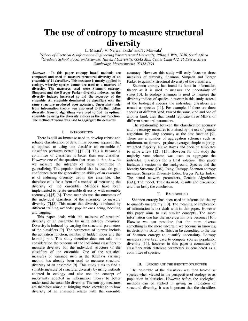 In this paper entropy based methods are compared and used to measure structural diversity of an ensemble of 21 classifiers. This measure is mostly applied in ecology, whereby species counts are used as a measure of diversity. The measures used were Shannon entropy, Simpsons and the Berger Parker diversity indexes. As the diversity indexes increased so did the accuracy of the ensemble. An ensemble dominated by classifiers with the same structure produced poor accuracy. Uncertainty rule from information theory was also used to further define diversity. Genetic algorithms were used to find the optimal ensemble by using the diversity indices as the cost function. The method of voting was used to aggregate the decisions.