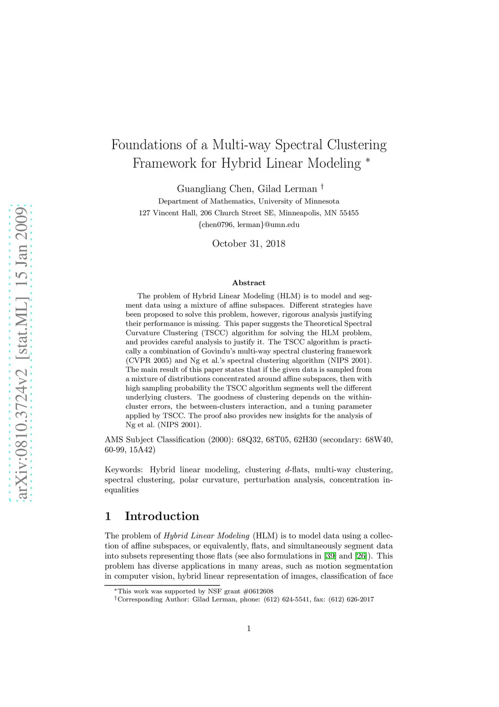 The problem of Hybrid Linear Modeling (HLM) is to model and segment data using a mixture of affine subspaces. Different strategies have been proposed to solve this problem, however, rigorous analysis justifying their performance is missing. This paper suggests the Theoretical Spectral Curvature Clustering (TSCC) algorithm for solving the HLM problem, and provides careful analysis to justify it. The TSCC algorithm is practically a combination of Govindu's multi-way spectral clustering framework (CVPR 2005) and Ng et al.'s spectral clustering algorithm (NIPS 2001). The main result of this paper states that if the given data is sampled from a mixture of distributions concentrated around affine subspaces, then with high sampling probability the TSCC algorithm segments well the different underlying clusters. The goodness of clustering depends on the within-cluster errors, the between-clusters interaction, and a tuning parameter applied by TSCC. The proof also provides new insights for the analysis of Ng et al. (NIPS 2001).