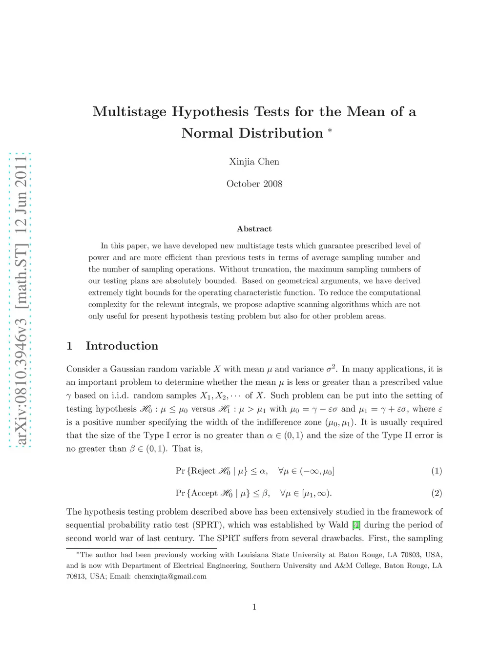 In this paper, we have developed new multistage tests which guarantee prescribed level of power and are more efficient than previous tests in terms of average sampling number and the number of sampling operations. Without truncation, the maximum sampling numbers of our testing plans are absolutely bounded. Based on geometrical arguments, we have derived extremely tight bounds for the operating characteristic function. To reduce the computational complexity for the relevant integrals, we propose adaptive scanning algorithms which are not only useful for present hypothesis testing problem but also for other problem areas.