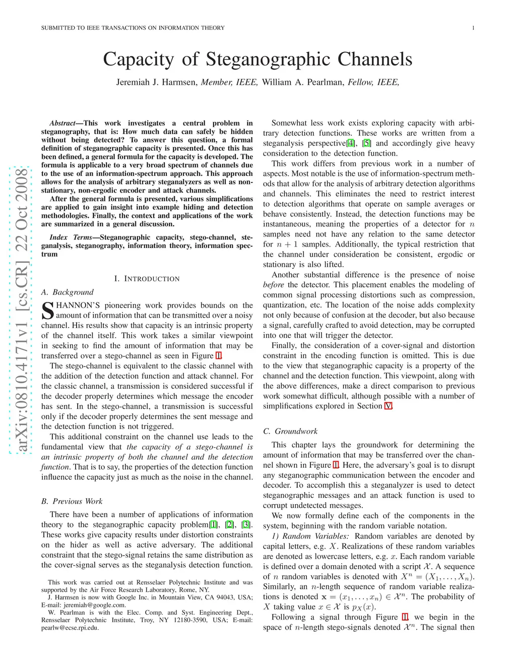 This work investigates a central problem in steganography, that is: How much data can safely be hidden without being detected? To answer this question, a formal definition of steganographic capacity is presented. Once this has been defined, a general formula for the capacity is developed. The formula is applicable to a very broad spectrum of channels due to the use of an information-spectrum approach. This approach allows for the analysis of arbitrary steganalyzers as well as non-stationary, non-ergodic encoder and attack channels. After the general formula is presented, various simplifications are applied to gain insight into example hiding and detection methodologies. Finally, the context and applications of the work are summarized in a general discussion.