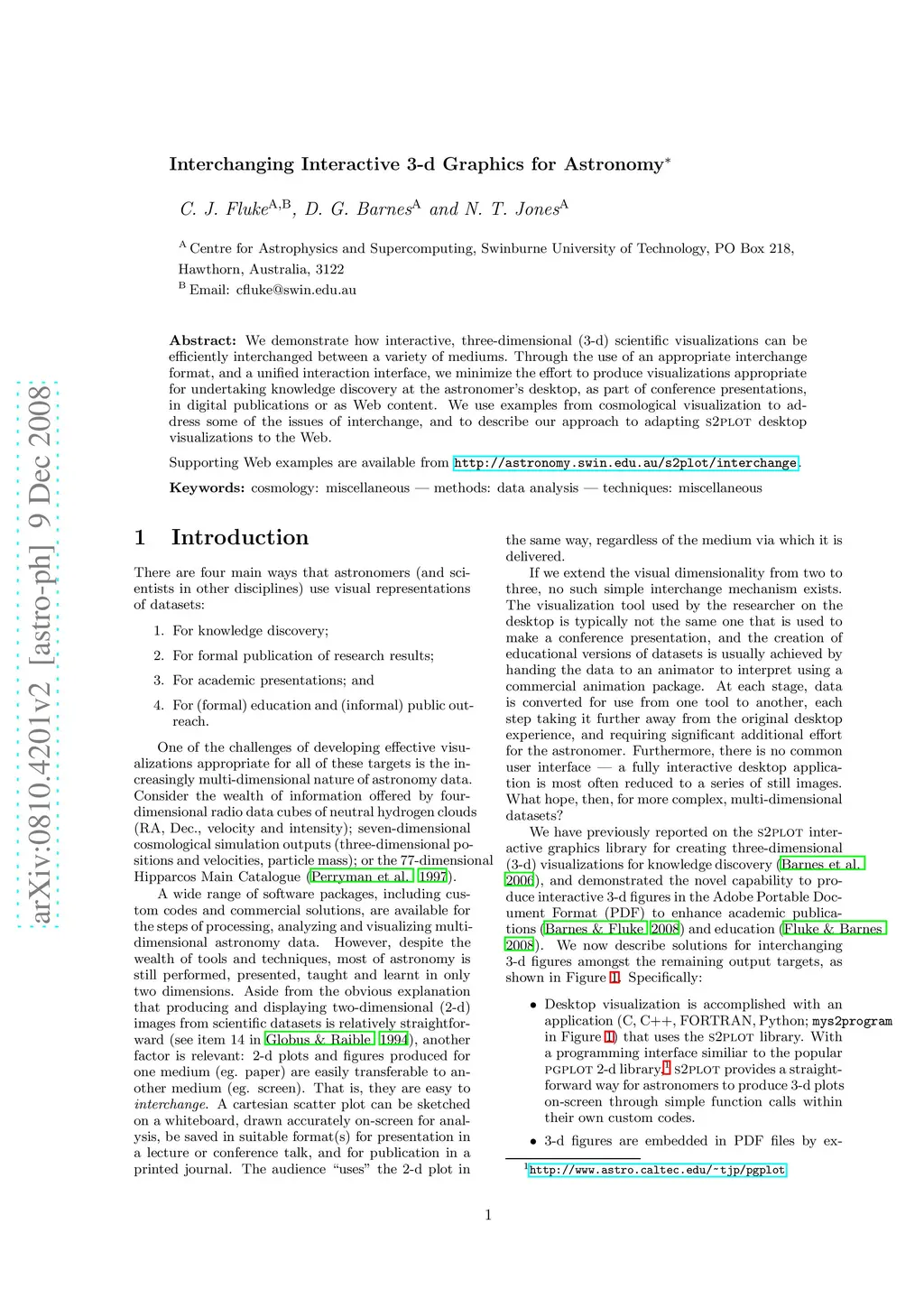 We demonstrate how interactive, three-dimensional (3-d) scientific visualizations can be efficiently interchanged between a variety of mediums. Through the use of an appropriate interchange format, and a unified interaction interface, we minimize the effort to produce visualizations appropriate for undertaking knowledge discovery at the astronomer's desktop, as part of conference presentations, in digital publications or as Web content. We use examples from cosmological visualization to address some of the issues of interchange, and to describe our approach to adapting S2PLOT desktop visualizations to the Web. Supporting demonstrations are available at http://astronomy.swin.edu.au/s2plot/interchange/