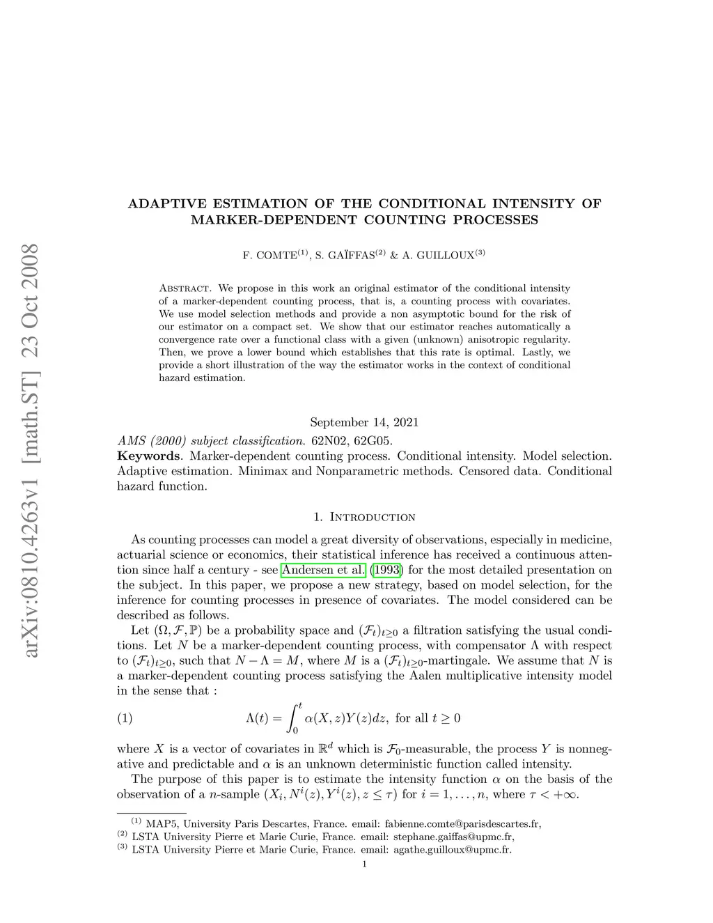We propose in this work an original estimator of the conditional intensity of a marker-dependent counting process, that is, a counting process with covariates. We use model selection methods and provide a non asymptotic bound for the risk of our estimator on a compact set. We show that our estimator reaches automatically a convergence rate over a functional class with a given (unknown) anisotropic regularity. Then, we prove a lower bound which establishes that this rate is optimal. Lastly, we provide a short illustration of the way the estimator works in the context of conditional hazard estimation.
