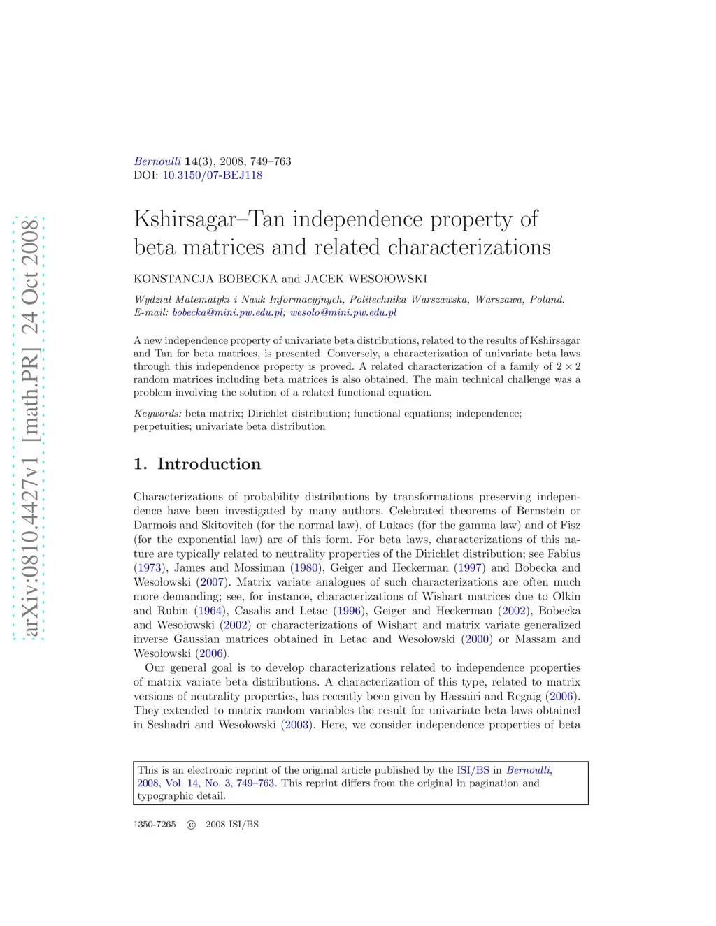 A new independence property of univariate beta distributions, related to the results of Kshirsagar and Tan for beta matrices, is presented. Conversely, a characterization of univariate beta laws through this independence property is proved. A related characterization of a family of random matrices including beta matrices is also obtained. The main technical challenge was a problem involving the solution of a related functional equation.