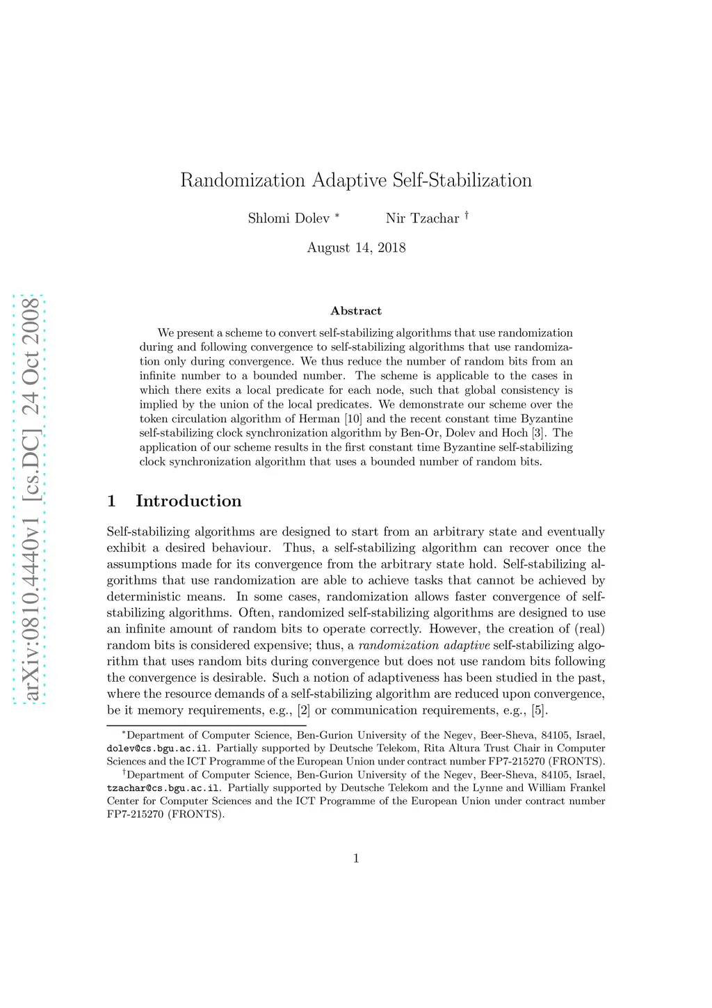 We present a scheme to convert self-stabilizing algorithms that use randomization during and following convergence to self-stabilizing algorithms that use randomization only during convergence. We thus reduce the number of random bits from an infinite number to a bounded number. The scheme is applicable to the cases in which there exits a local predicate for each node, such that global consistency is implied by the union of the local predicates. We demonstrate our scheme over the token circulation algorithm of Herman and the recent constant time Byzantine self-stabilizing clock synchronization algorithm by Ben-Or, Dolev and Hoch. The application of our scheme results in the first constant time Byzantine self-stabilizing clock synchronization algorithm that uses a bounded number of random bits.
