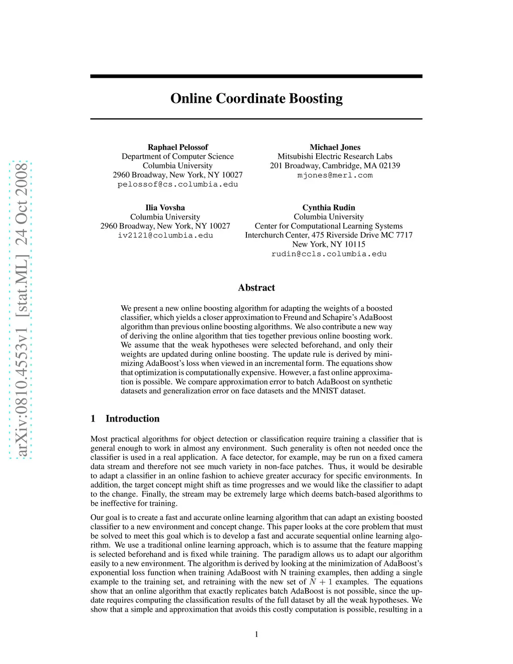 We present a new online boosting algorithm for adapting the weights of a boosted classifier, which yields a closer approximation to Freund and Schapire's AdaBoost algorithm than previous online boosting algorithms. We also contribute a new way of deriving the online algorithm that ties together previous online boosting work. We assume that the weak hypotheses were selected beforehand, and only their weights are updated during online boosting. The update rule is derived by minimizing AdaBoost's loss when viewed in an incremental form. The equations show that optimization is computationally expensive. However, a fast online approximation is possible. We compare approximation error to batch AdaBoost on synthetic datasets and generalization error on face datasets and the MNIST dataset.
