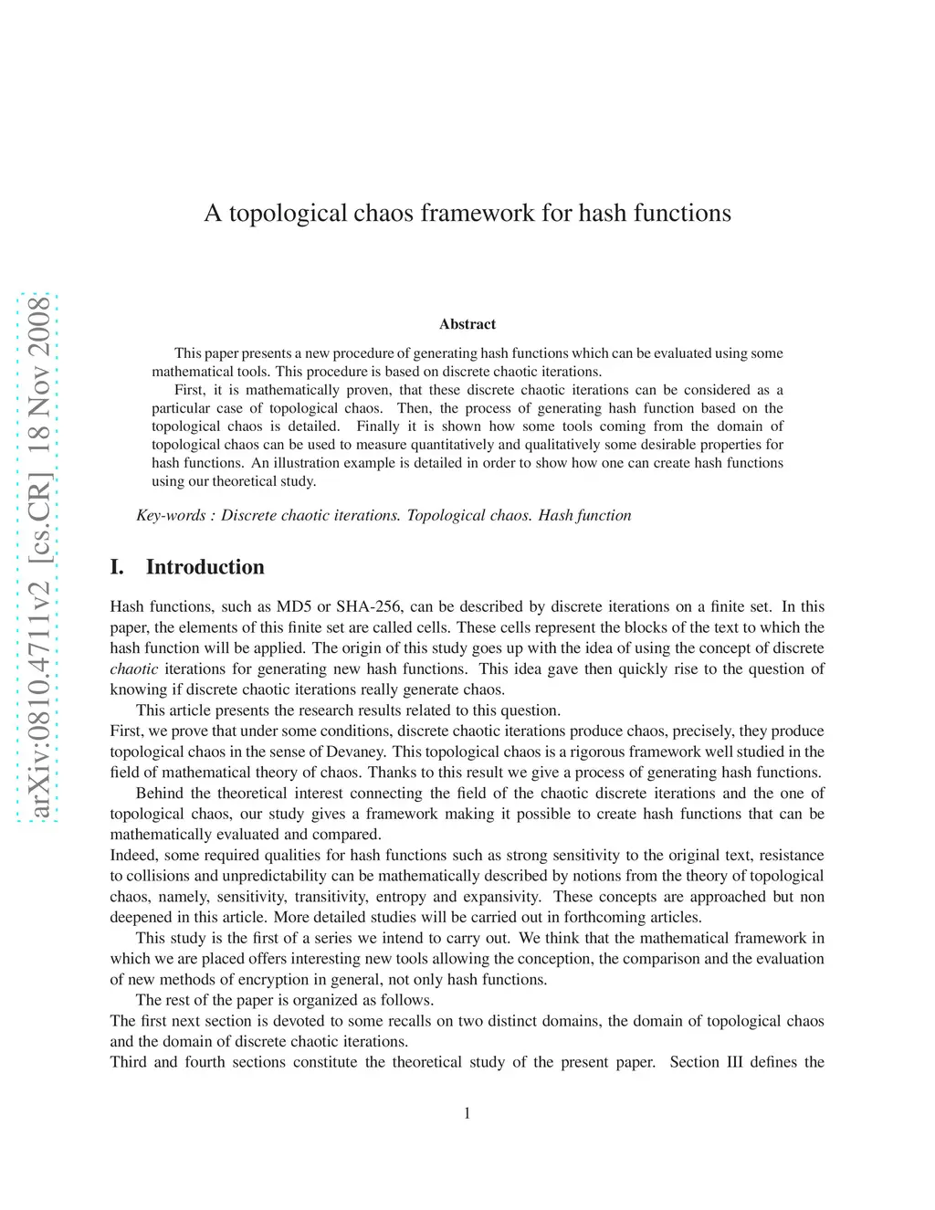 This paper presents a new procedure of generating hash functions which can be evaluated using some mathematical tools. This procedure is based on discrete chaotic iterations. First, it is mathematically proven, that these discrete chaotic iterations can be considered as a \linebreak particular case of topological chaos. Then, the process of generating hash function based on the \linebreak topological chaos is detailed. Finally it is shown how some tools coming from the domain of \linebreak topological chaos can be used to measure quantitatively and qualitatively some desirable properties for hash functions. An illustration example is detailed in order to show how one can create hash functions using our theoretical study. Key-words : Discrete chaotic iterations. Topological chaos. Hash function
