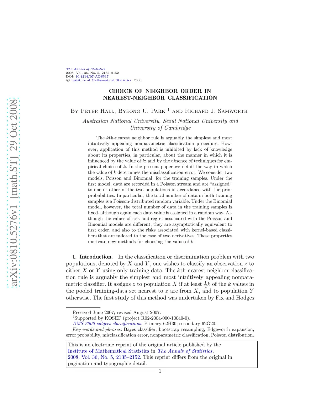 The th-nearest neighbor rule is arguably the simplest and most intuitively appealing nonparametric classification procedure. However, application of this method is inhibited by lack of knowledge about its properties, in particular, about the manner in which it is influenced by the value of ; and by the absence of techniques for empirical choice of . In the present paper we detail the way in which the value of determines the misclassification error. We consider two models, Poisson and Binomial, for the training samples. Under the first model, data are recorded in a Poisson stream and are "assigned" to one or other of the two populations in accordance with the prior probabilities. In particular, the total number of data in both training samples is a Poisson-distributed random variable. Under the Binomial model, however, the total number of data in the training samples is fixed, although again each data value is assigned in a random way. Although the values of risk and regret associated with the Poisson and Binomial models are different, they are asymptotically equivalent to first order, and also to the risks associated with kernel-based classifiers that are tailored to the case of two derivatives. These properties motivate new methods for choosing the value of .