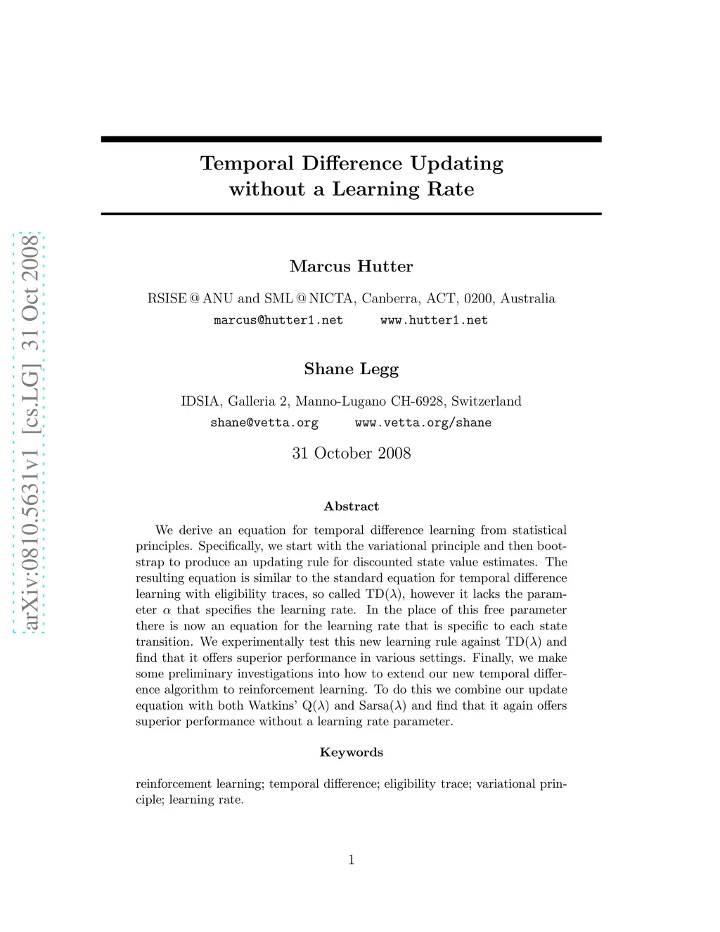 We derive an equation for temporal difference learning from statistical principles. Specifically, we start with the variational principle and then bootstrap to produce an updating rule for discounted state value estimates. The resulting equation is similar to the standard equation for temporal difference learning with eligibility traces, so called TD(lambda), however it lacks the parameter alpha that specifies the learning rate. In the place of this free parameter there is now an equation for the learning rate that is specific to each state transition. We experimentally test this new learning rule against TD(lambda) and find that it offers superior performance in various settings. Finally, we make some preliminary investigations into how to extend our new temporal difference algorithm to reinforcement learning. To do this we combine our update equation with both Watkins' Q(lambda) and Sarsa(lambda) and find that it again offers superior performance without a learning rate parameter.