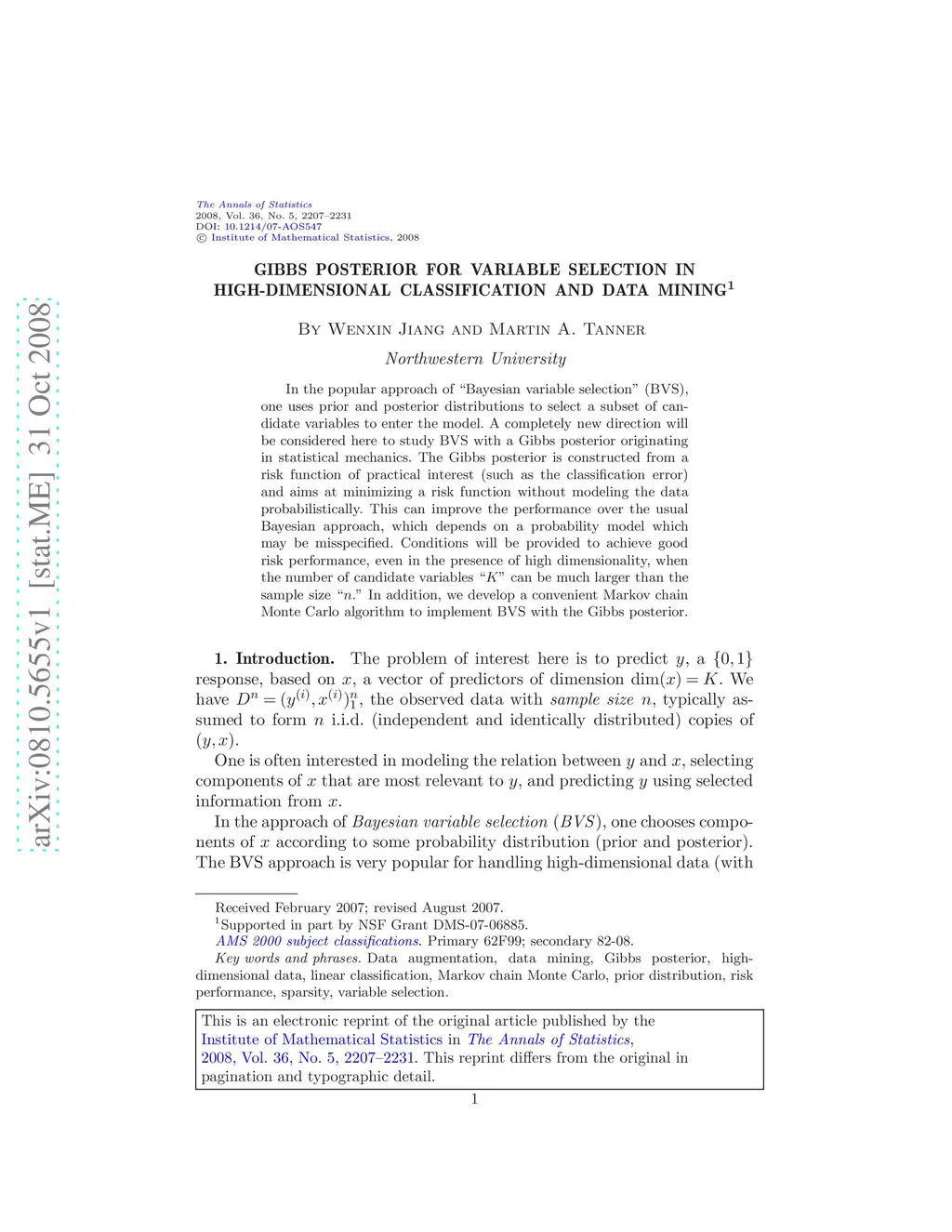In the popular approach of "Bayesian variable selection" (BVS), one uses prior and posterior distributions to select a subset of candidate variables to enter the model. A completely new direction will be considered here to study BVS with a Gibbs posterior originating in statistical mechanics. The Gibbs posterior is constructed from a risk function of practical interest (such as the classification error) and aims at minimizing a risk function without modeling the data probabilistically. This can improve the performance over the usual Bayesian approach, which depends on a probability model which may be misspecified. Conditions will be provided to achieve good risk performance, even in the presence of high dimensionality, when the number of candidate variables "" can be much larger than the sample size "." In addition, we develop a convenient Markov chain Monte Carlo algorithm to implement BVS with the Gibbs posterior.