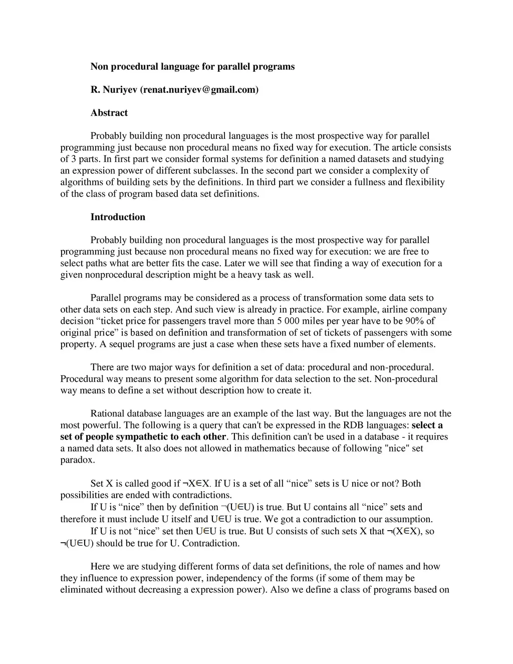 Probably building non procedural languages is the most prospective way for parallel programming just because non procedural means no fixed way for execution. The article consists of 3 parts. In first part we consider formal systems for definition a named datasets and studying an expression power of different subclasses. In the second part we consider a complexity of algorithms of building sets by the definitions. In third part we consider a fullness and flexibility of the class of program based data set definitions.