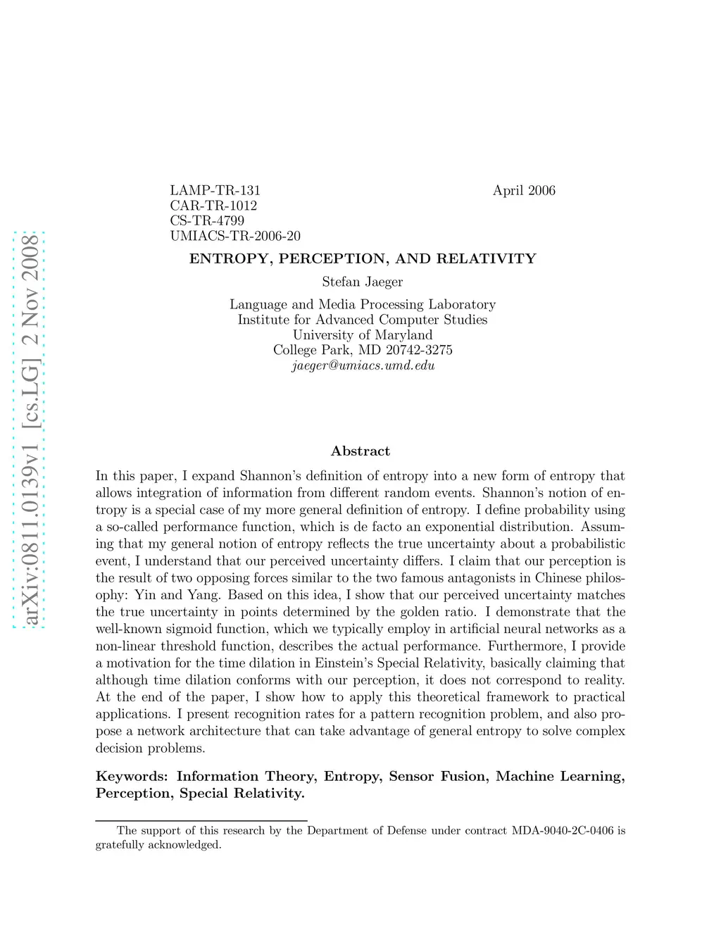 In this paper, I expand Shannon's definition of entropy into a new form of entropy that allows integration of information from different random events. Shannon's notion of entropy is a special case of my more general definition of entropy. I define probability using a so-called performance function, which is de facto an exponential distribution. Assuming that my general notion of entropy reflects the true uncertainty about a probabilistic event, I understand that our perceived uncertainty differs. I claim that our perception is the result of two opposing forces similar to the two famous antagonists in Chinese philosophy: Yin and Yang. Based on this idea, I show that our perceived uncertainty matches the true uncertainty in points determined by the golden ratio. I demonstrate that the well-known sigmoid function, which we typically employ in artificial neural networks as a non-linear threshold function, describes the actual performance. Furthermore, I provide a motivation for the time dilation in Einstein's Special Relativity, basically claiming that although time dilation conforms with our perception, it does not correspond to reality. At the end of the paper, I show how to apply this theoretical framework to practical applications. I present recognition rates for a pattern recognition problem, and also propose a network architecture that can take advantage of general entropy to solve complex decision problems.