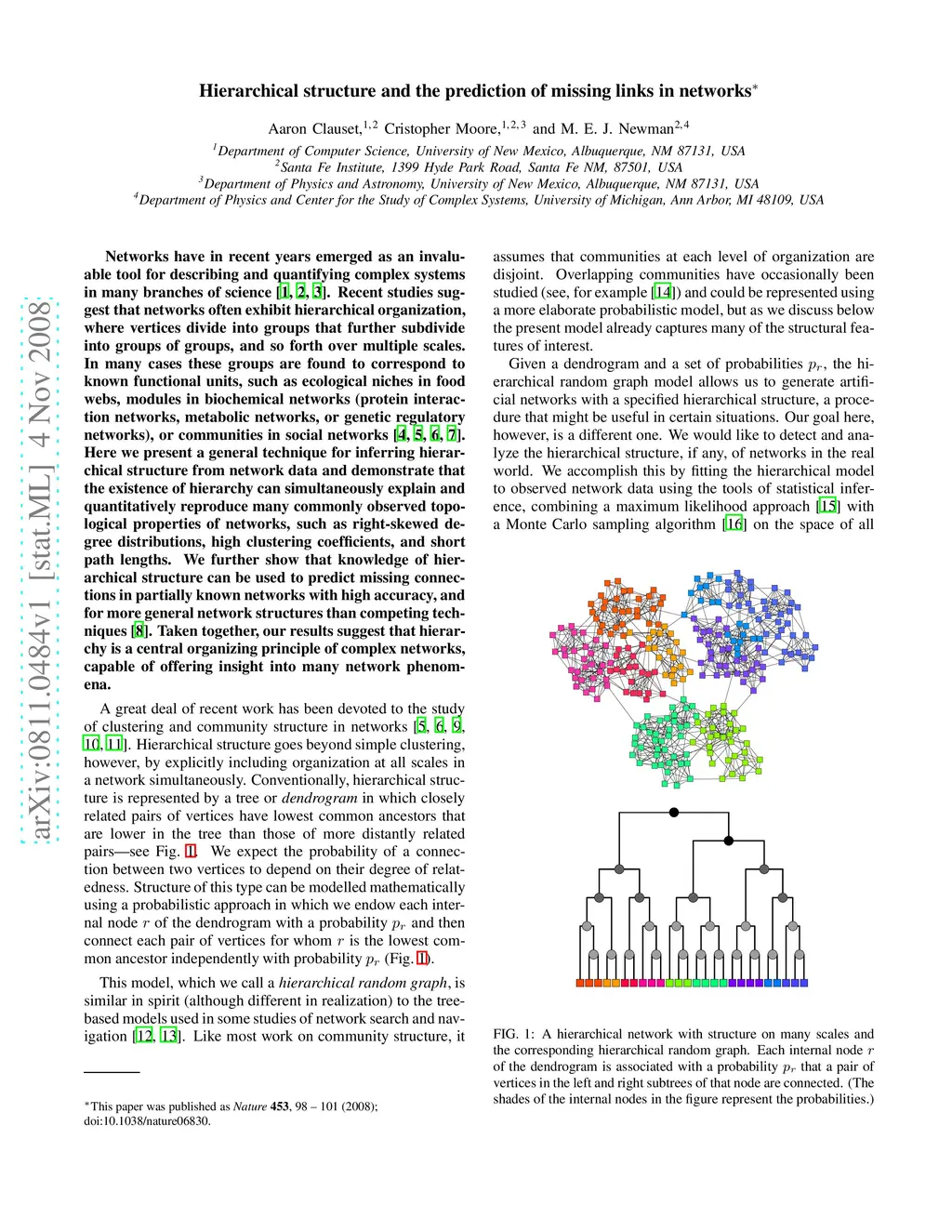 Networks have in recent years emerged as an invaluable tool for describing and quantifying complex systems in many branches of science. Recent studies suggest that networks often exhibit hierarchical organization, where vertices divide into groups that further subdivide into groups of groups, and so forth over multiple scales. In many cases these groups are found to correspond to known functional units, such as ecological niches in food webs, modules in biochemical networks (protein interaction networks, metabolic networks, or genetic regulatory networks), or communities in social networks. Here we present a general technique for inferring hierarchical structure from network data and demonstrate that the existence of hierarchy can simultaneously explain and quantitatively reproduce many commonly observed topological properties of networks, such as right-skewed degree distributions, high clustering coefficients, and short path lengths. We further show that knowledge of hierarchical structure can be used to predict missing connections in partially known networks with high accuracy, and for more general network structures than competing techniques. Taken together, our results suggest that hierarchy is a central organizing principle of complex networks, capable of offering insight into many network phenomena.