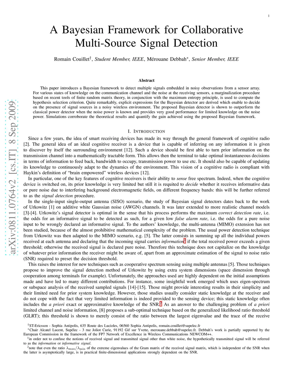 A Bayesian inference learning process for cognitive receivers is provided in this paper. We focus on the particular case of signal detectionas an explanatory example to the learning framework. Under any prior state of knowledge on the communication channel, an information theoretic criterion is presented to decide on the presence of informative data in a noisy wireless MIMO communication. We detail the particular cases of knowledge, or absence of knowledge at the receiver, of the number of transmit antennas and noise power. The provided method is instrumental to provide intelligence to the receiver and gives birth to a novel Bayesian signal detector. The detector is compared to the classical power detector and provides detection performance upper bounds. Simulations corroborate the theoretical results and quantify the gain achieved using the proposed Bayesian framework.