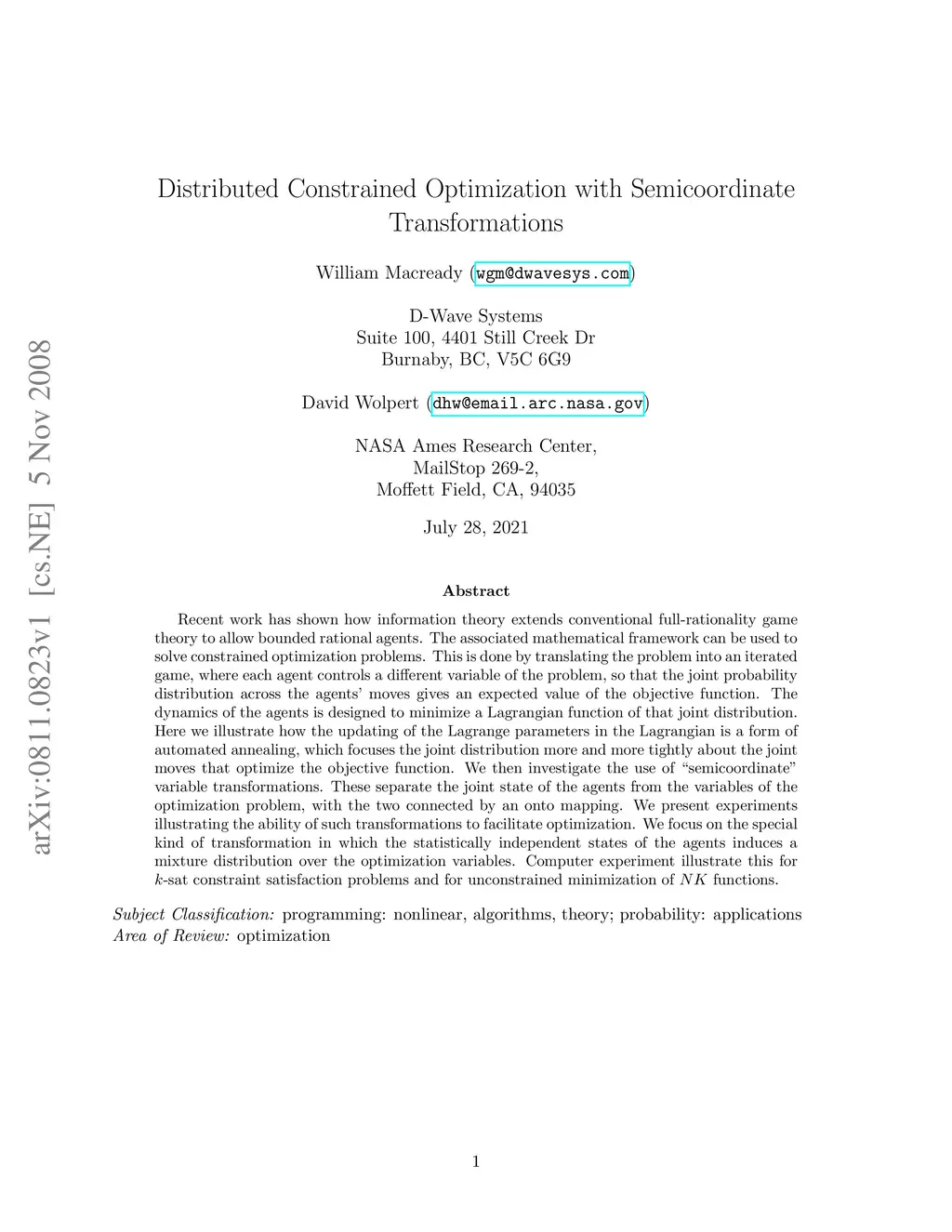 Recent work has shown how information theory extends conventional full-rationality game theory to allow bounded rational agents. The associated mathematical framework can be used to solve constrained optimization problems. This is done by translating the problem into an iterated game, where each agent controls a different variable of the problem, so that the joint probability distribution across the agents' moves gives an expected value of the objective function. The dynamics of the agents is designed to minimize a Lagrangian function of that joint distribution. Here we illustrate how the updating of the Lagrange parameters in the Lagrangian is a form of automated annealing, which focuses the joint distribution more and more tightly about the joint moves that optimize the objective function. We then investigate the use of ``semicoordinate'' variable transformations. These separate the joint state of the agents from the variables of the optimization problem, with the two connected by an onto mapping. We present experiments illustrating the ability of such transformations to facilitate optimization. We focus on the special kind of transformation in which the statistically independent states of the agents induces a mixture distribution over the optimization variables. Computer experiment illustrate this for -sat constraint satisfaction problems and for unconstrained minimization of functions.