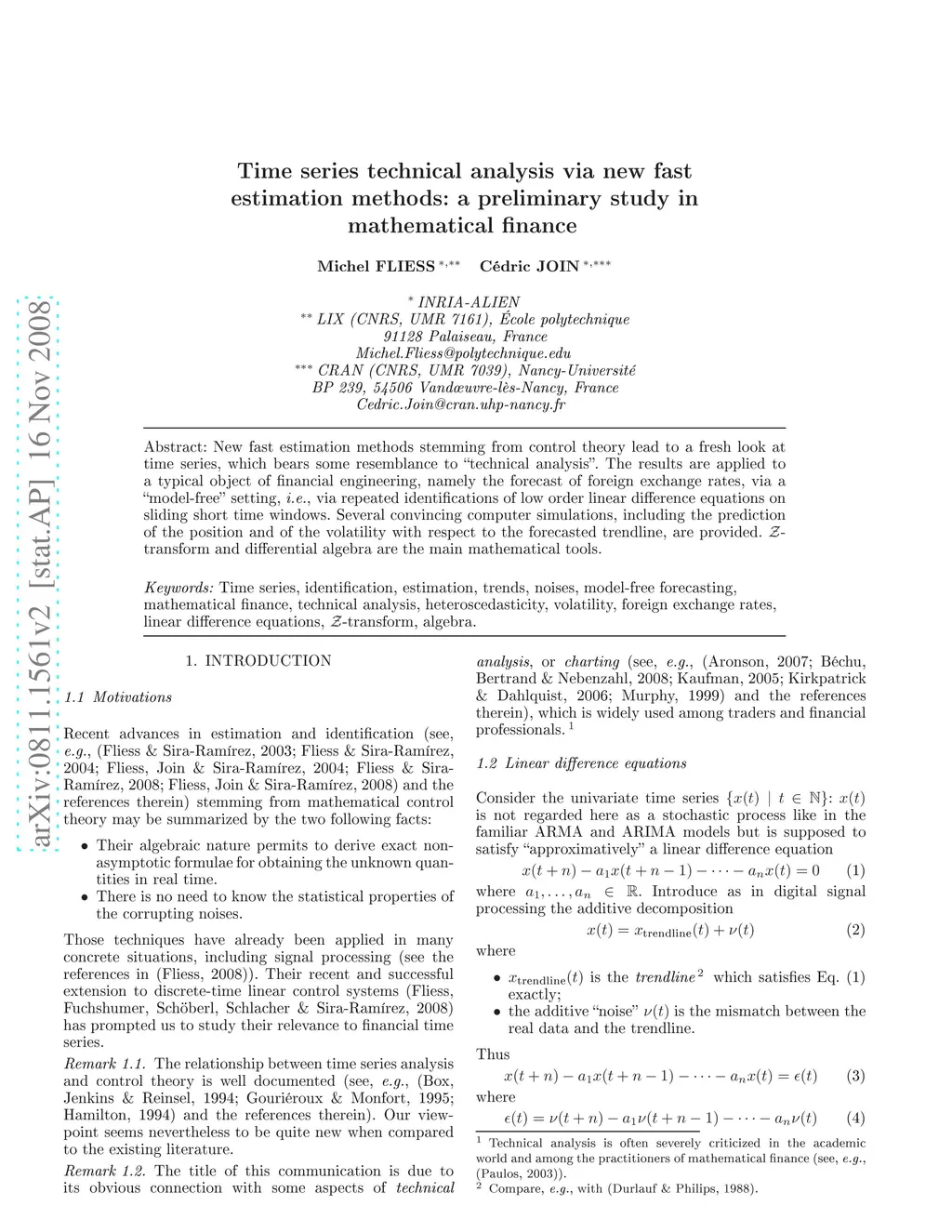 New fast estimation methods stemming from control theory lead to a fresh look at time series, which bears some resemblance to "technical analysis". The results are applied to a typical object of financial engineering, namely the forecast of foreign exchange rates, via a "model-free" setting, i.e., via repeated identifications of low order linear difference equations on sliding short time windows. Several convincing computer simulations, including the prediction of the position and of the volatility with respect to the forecasted trendline, are provided. -transform and differential algebra are the main mathematical tools.
