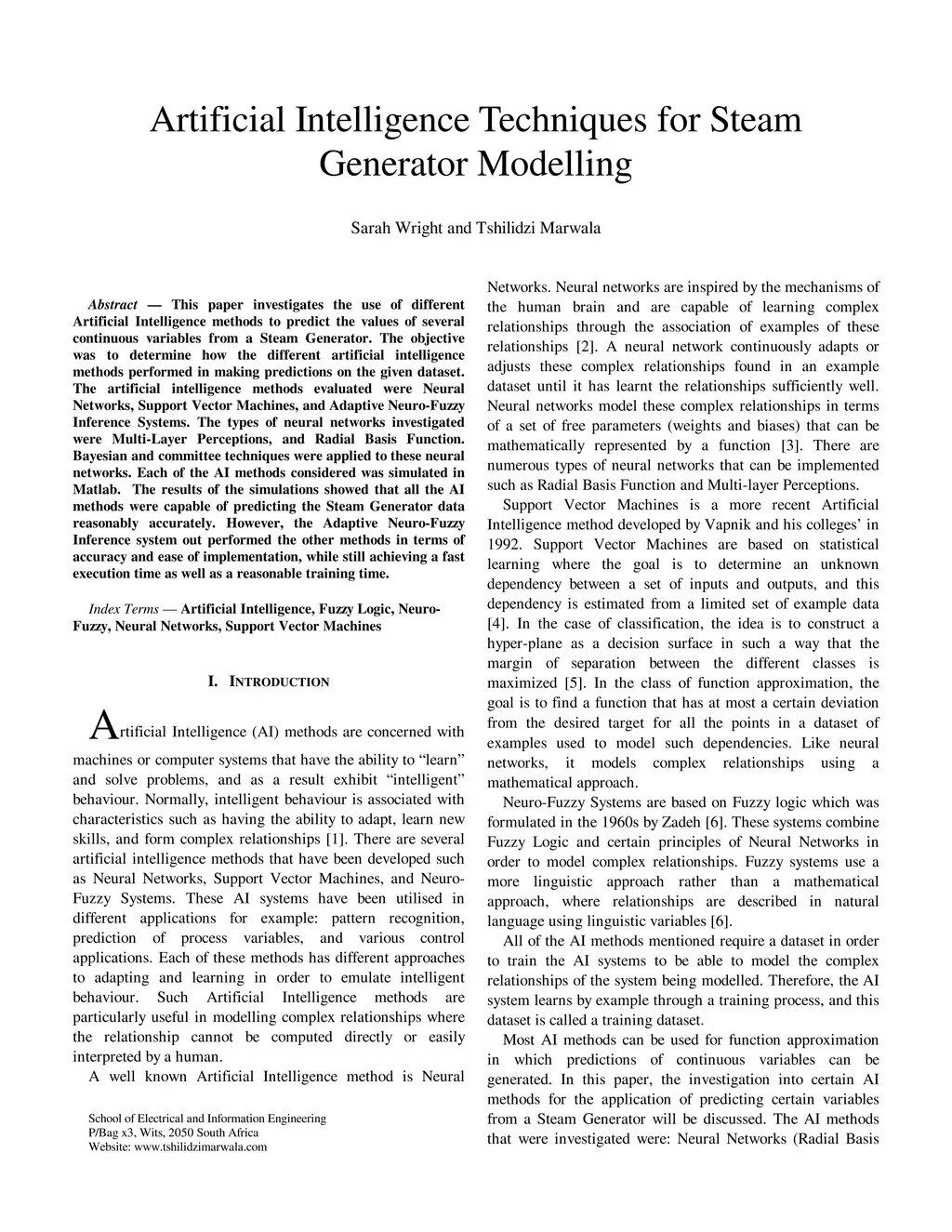 This paper investigates the use of different Artificial Intelligence methods to predict the values of several continuous variables from a Steam Generator. The objective was to determine how the different artificial intelligence methods performed in making predictions on the given dataset. The artificial intelligence methods evaluated were Neural Networks, Support Vector Machines, and Adaptive Neuro-Fuzzy Inference Systems. The types of neural networks investigated were Multi-Layer Perceptions, and Radial Basis Function. Bayesian and committee techniques were applied to these neural networks. Each of the AI methods considered was simulated in Matlab. The results of the simulations showed that all the AI methods were capable of predicting the Steam Generator data reasonably accurately. However, the Adaptive Neuro-Fuzzy Inference system out performed the other methods in terms of accuracy and ease of implementation, while still achieving a fast execution time as well as a reasonable training time.