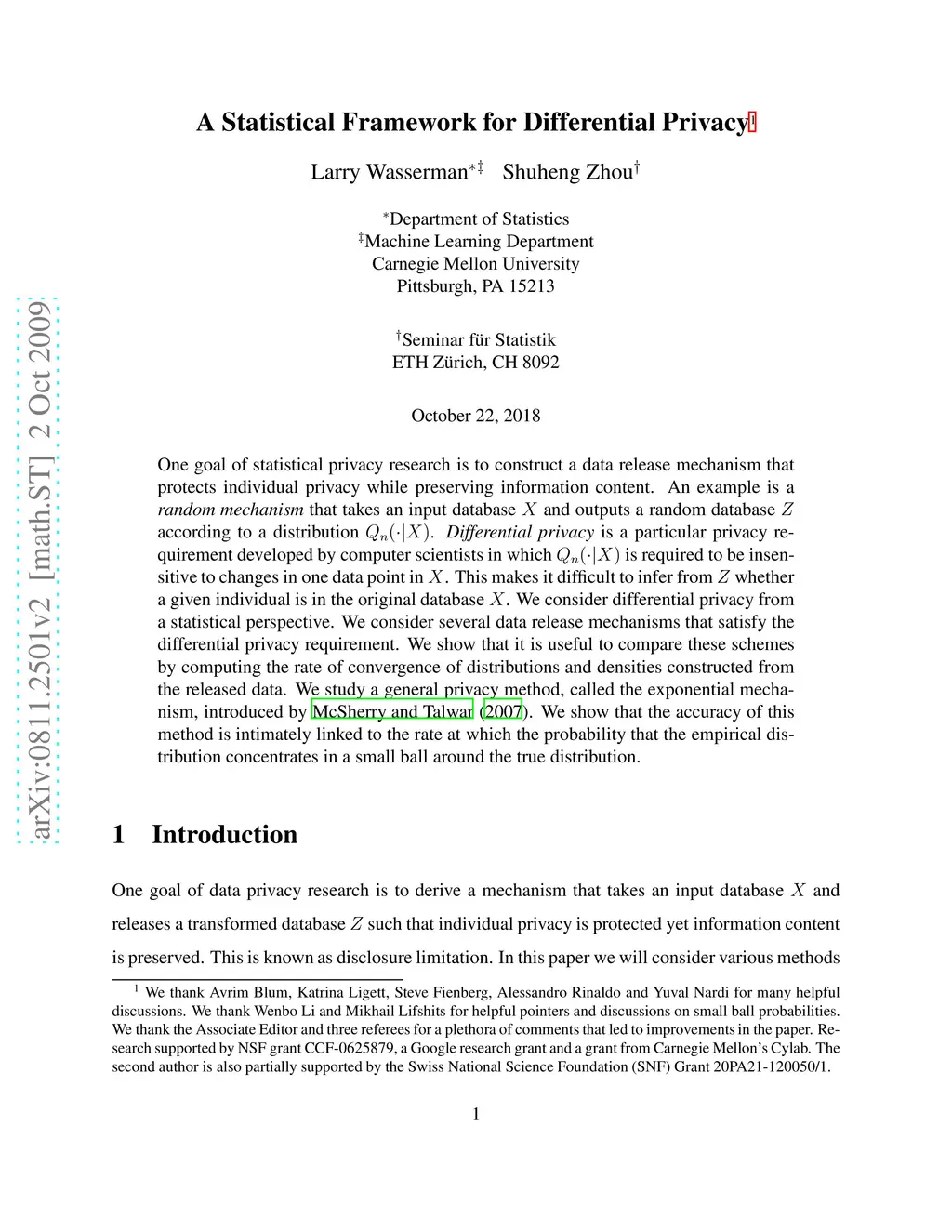 One goal of statistical privacy research is to construct a data release mechanism that protects individual privacy while preserving information content. An example is a {\em random mechanism} that takes an input database and outputs a random database according to a distribution . {\em Differential privacy} is a particular privacy requirement developed by computer scientists in which is required to be insensitive to changes in one data point in . This makes it difficult to infer from whether a given individual is in the original database . We consider differential privacy from a statistical perspective. We consider several data release mechanisms that satisfy the differential privacy requirement. We show that it is useful to compare these schemes by computing the rate of convergence of distributions and densities constructed from the released data. We study a general privacy method, called the exponential mechanism, introduced by McSherry and Talwar (2007). We show that the accuracy of this method is intimately linked to the rate at which the probability that the empirical distribution concentrates in a small ball around the true distribution.