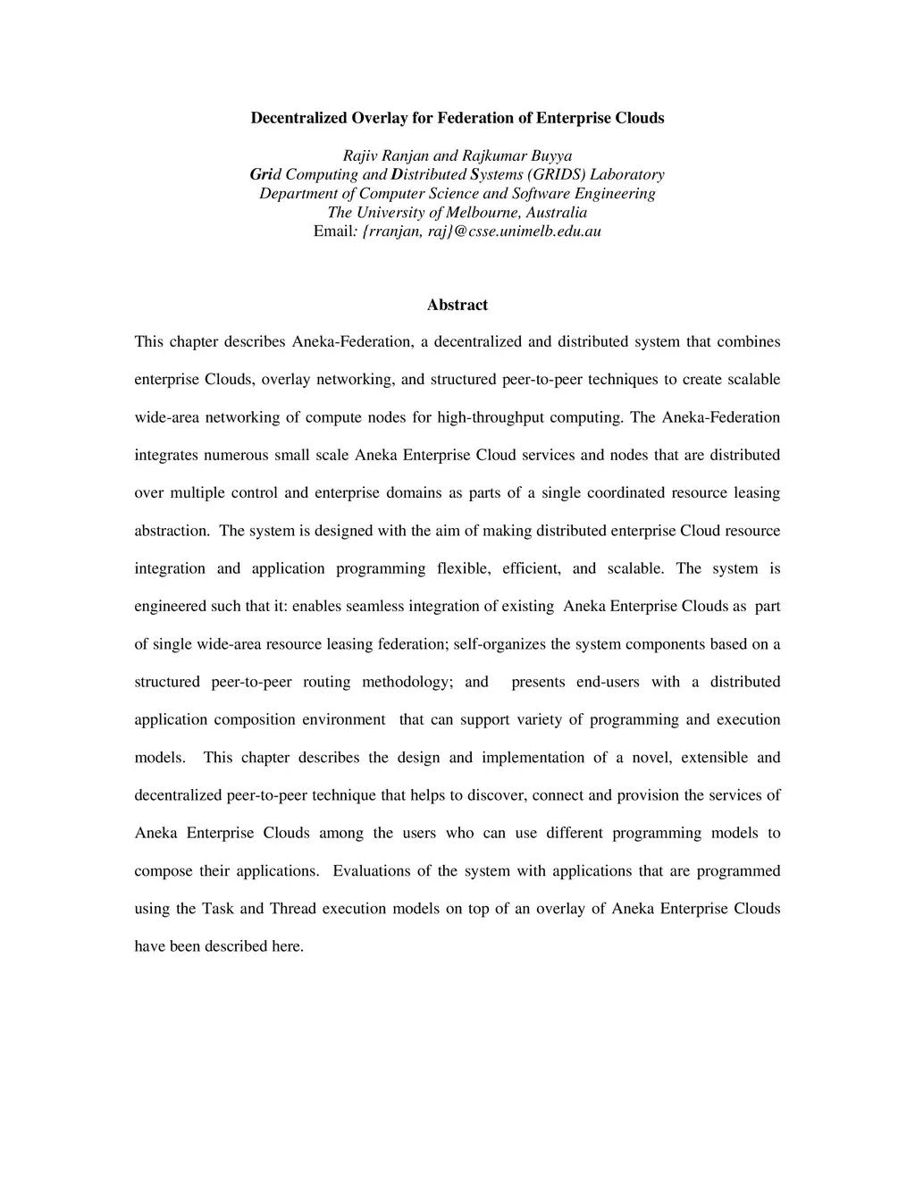 This chapter describes Aneka-Federation, a decentralized and distributed system that combines enterprise Clouds, overlay networking, and structured peer-to-peer techniques to create scalable wide-area networking of compute nodes for high-throughput computing. The Aneka-Federation integrates numerous small scale Aneka Enterprise Cloud services and nodes that are distributed over multiple control and enterprise domains as parts of a single coordinated resource leasing abstraction. The system is designed with the aim of making distributed enterprise Cloud resource integration and application programming flexible, efficient, and scalable. The system is engineered such that it: enables seamless integration of existing Aneka Enterprise Clouds as part of single wide-area resource leasing federation; self-organizes the system components based on a structured peer-to-peer routing methodology; and presents end-users with a distributed application composition environment that can support variety of programming and execution models. This chapter describes the design and implementation of a novel, extensible and decentralized peer-to-peer technique that helps to discover, connect and provision the services of Aneka Enterprise Clouds among the users who can use different programming models to compose their applications. Evaluations of the system with applications that are programmed using the Task and Thread execution models on top of an overlay of Aneka Enterprise Clouds have been described here.