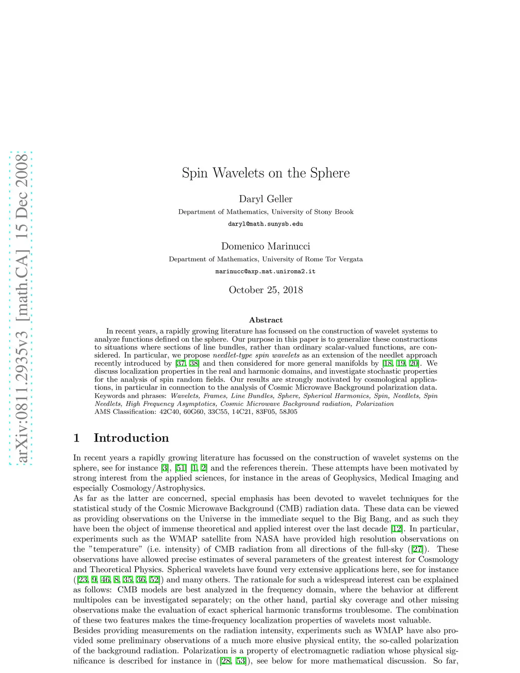 In recent years, a rapidly growing literature has focussed on the construction of wavelet systems to analyze functions defined on the sphere. Our purpose in this paper is to generalize these constructions to situations where sections of line bundles, rather than ordinary scalar-valued functions, are considered. In particular, we propose {\em needlet-type spin wavelets} as an extension of the needlet approach recently introduced by Narcowich, Petrushev and Ward, and then considered for more general manifolds by Geller and Mayeli. We discuss localization properties in the real and harmonic domains, and investigate stochastic properties for the analysis of spin random fields. Our results are strongly motivated by cosmological applications, in particular in connection to the analysis of Cosmic Microwave Background polarization data.