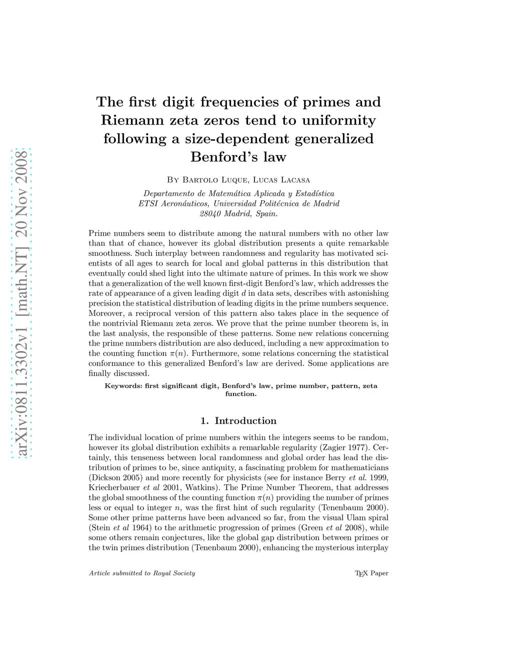 Prime numbers seem to distribute among the natural numbers with no other law than that of chance, however its global distribution presents a quite remarkable smoothness. Such interplay between randomness and regularity has motivated sci- entists of all ages to search for local and global patterns in this distribution that eventually could shed light into the ultimate nature of primes. In this work we show that a generalization of the well known first-digit Benford's law, which addresses the rate of appearance of a given leading digit d in data sets, describes with astonishing precision the statistical distribution of leading digits in the prime numbers sequence. Moreover, a reciprocal version of this pattern also takes place in the sequence of the nontrivial Riemann zeta zeros. We prove that the prime number theorem is, in the last analysis, the responsible of these patterns. Some new relations concerning the prime numbers distribution are also deduced, including a new approximation to the counting function pi(n). Furthermore, some relations concerning the statistical conformance to this generalized Benford's law are derived. Some applications are finally discussed.