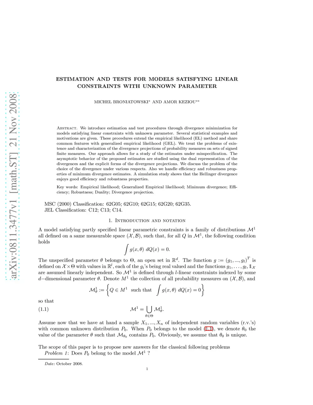We introduce estimation and test procedures through divergence minimization for models satisfying linear constraints with unknown parameter. Several statistical examples and motivations are given. These procedures extend the empirical likelihood (EL) method and share common features with generalized empirical likelihood (GEL). We treat the problems of existence and characterization of the divergence projections of probability measures on sets of signed finite measures. Our approach allows for a study of the estimates under misspecification. The asymptotic behavior of the proposed estimates are studied using the dual representation of the divergences and the explicit forms of the divergence projections. We discuss the problem of the choice of the divergence under various respects. Also we handle efficiency and robustness properties of minimum divergence estimates. A simulation study shows that the Hellinger divergence enjoys good efficiency and robustness properties.