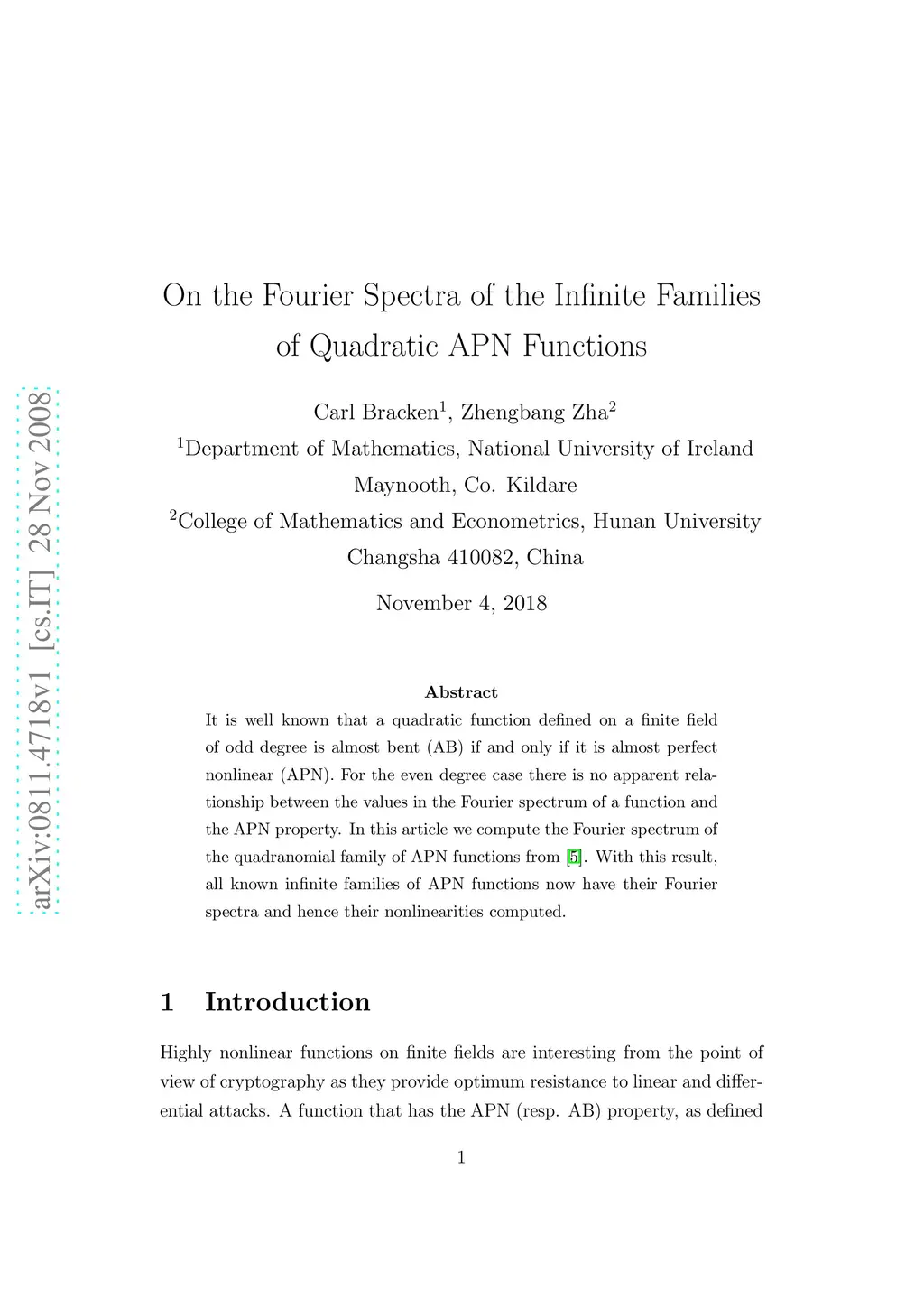 It is well known that a quadratic function defined on a finite field of odd degree is almost bent (AB) if and only if it is almost perfect nonlinear (APN). For the even degree case there is no apparent relationship between the values in the Fourier spectrum of a function and the APN property. In this article we compute the Fourier spectrum of the new quadranomial family of APN functions. With this result, all known infinite families of APN functions now have their Fourier spectra and hence their nonlinearities computed.