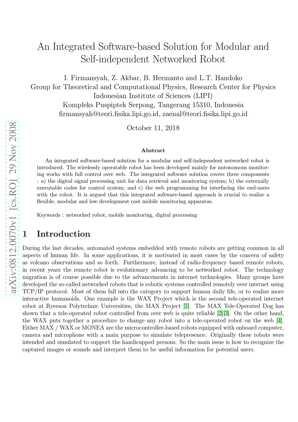 An integrated software-based solution for a modular and self-independent networked robot is introduced. The wirelessly operatable robot has been developed mainly for autonomous monitoring works with full control over web. The integrated software solution covers three components : a) the digital signal processing unit for data retrieval and monitoring system; b) the externally executable codes for control system; and c) the web programming for interfacing the end-users with the robot. It is argued that this integrated software-based approach is crucial to realize a flexible, modular and low development cost mobile monitoring apparatus.
