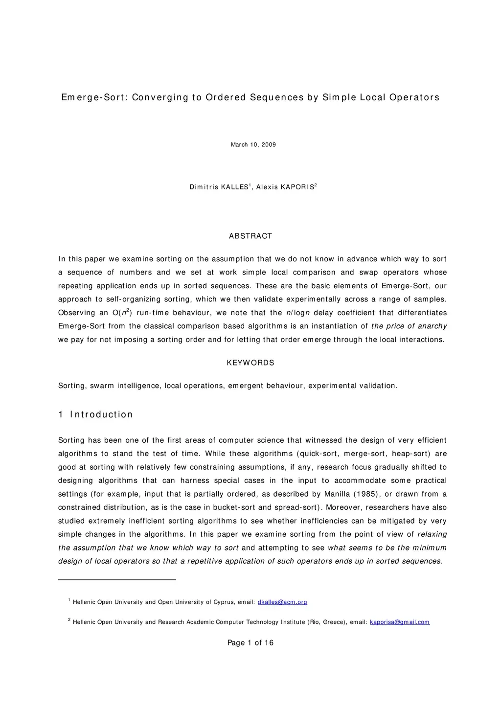 In this paper we examine sorting on the assumption that we do not know in advance which way to sort a sequence of numbers and we set at work simple local comparison and swap operators whose repeating application ends up in sorted sequences. These are the basic elements of Emerge-Sort, our approach to self-organizing sorting, which we then validate experimentally across a range of samples. Observing an O(n2) run-time behaviour, we note that the n/logn delay coefficient that differentiates Emerge-Sort from the classical comparison based algorithms is an instantiation of the price of anarchy we pay for not imposing a sorting order and for letting that order emerge through the local interactions.