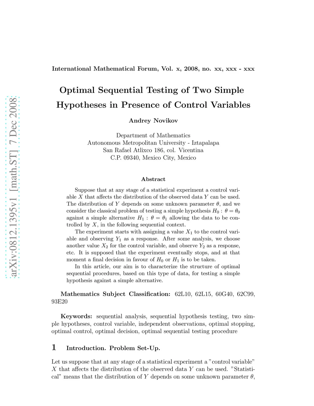 Suppose that at any stage of a statistical experiment a control variable that affects the distribution of the observed data can be used. The distribution of depends on some unknown parameter , and we consider the classical problem of testing a simple hypothesis against a simple alternative allowing the data to be controlled by , in the following sequential context. The experiment starts with assigning a value to the control variable and observing as a response. After some analysis, we choose another value for the control variable, and observe as a response, etc. It is supposed that the experiment eventually stops, and at that moment a final decision in favour of or is to be taken. In this article, our aim is to characterize the structure of optimal sequential procedures, based on this type of data, for testing a simple hypothesis against a simple alternative.