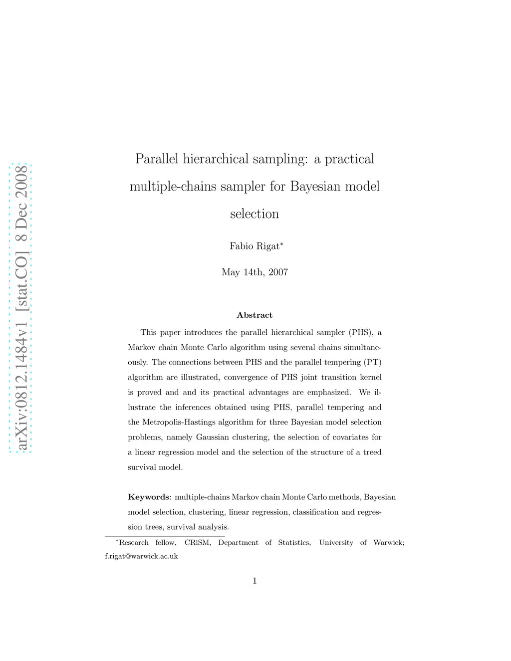 This paper introduces the parallel hierarchical sampler (PHS), a Markov chain Monte Carlo algorithm using several chains simultaneously. The connections between PHS and the parallel tempering (PT) algorithm are illustrated, convergence of PHS joint transition kernel is proved and and its practical advantages are emphasized. We illustrate the inferences obtained using PHS, parallel tempering and the Metropolis-Hastings algorithm for three Bayesian model selection problems, namely Gaussian clustering, the selection of covariates for a linear regression model and the selection of the structure of a treed survival model.