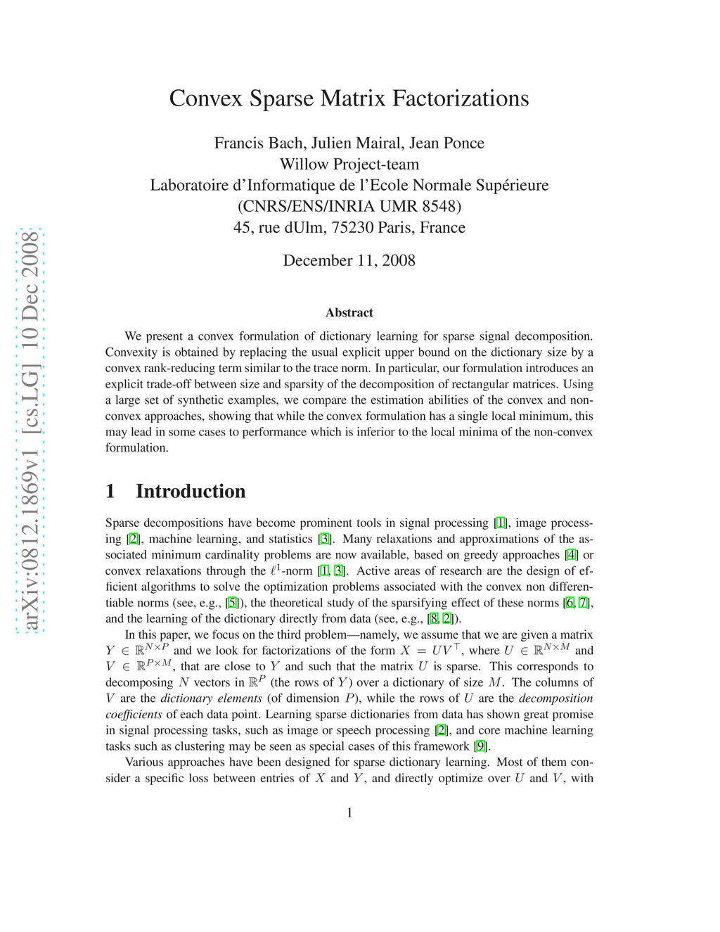 We present a convex formulation of dictionary learning for sparse signal decomposition. Convexity is obtained by replacing the usual explicit upper bound on the dictionary size by a convex rank-reducing term similar to the trace norm. In particular, our formulation introduces an explicit trade-off between size and sparsity of the decomposition of rectangular matrices. Using a large set of synthetic examples, we compare the estimation abilities of the convex and non-convex approaches, showing that while the convex formulation has a single local minimum, this may lead in some cases to performance which is inferior to the local minima of the non-convex formulation.