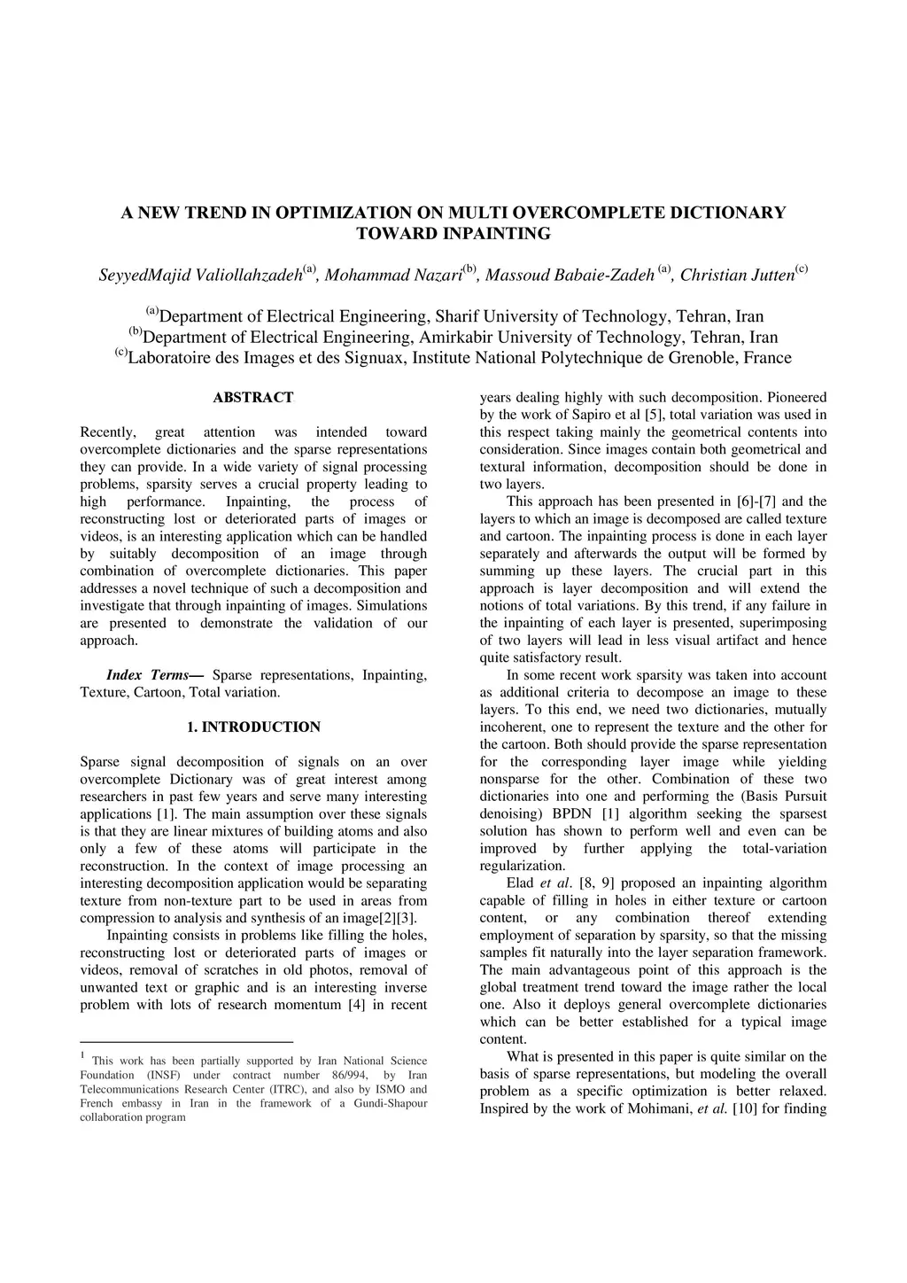 Recently, great attention was intended toward overcomplete dictionaries and the sparse representations they can provide. In a wide variety of signal processing problems, sparsity serves a crucial property leading to high performance. Inpainting, the process of reconstructing lost or deteriorated parts of images or videos, is an interesting application which can be handled by suitably decomposition of an image through combination of overcomplete dictionaries. This paper addresses a novel technique of such a decomposition and investigate that through inpainting of images. Simulations are presented to demonstrate the validation of our approach.