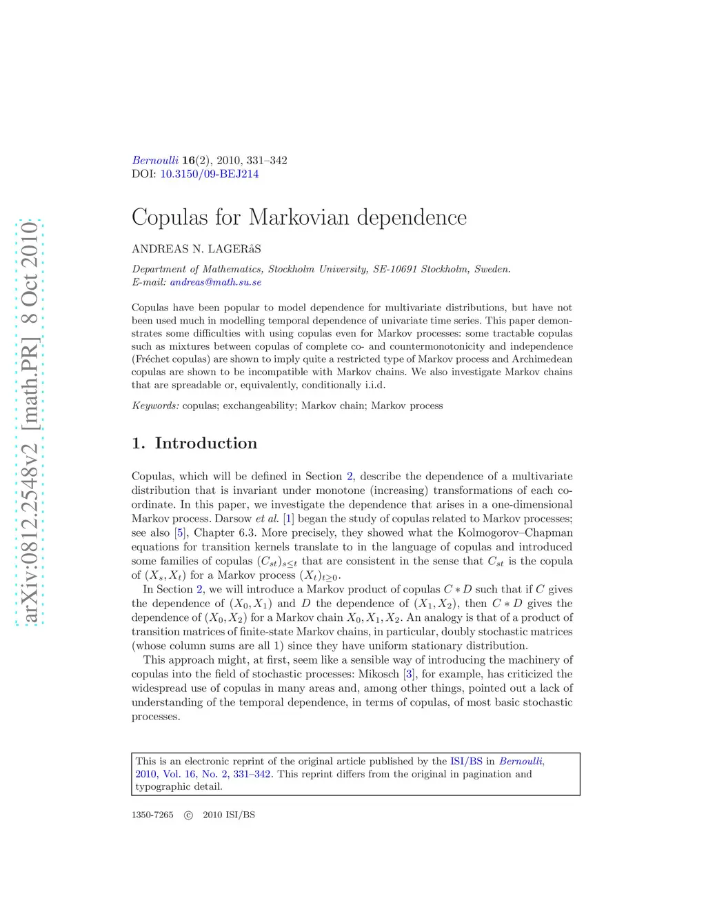 Copulas have been popular to model dependence for multivariate distributions, but have not been used much in modelling temporal dependence of univariate time series. This paper demonstrates some difficulties with using copulas even for Markov processes: some tractable copulas such as mixtures between copulas of complete co- and countermonotonicity and independence (Fr\'{e}chet copulas) are shown to imply quite a restricted type of Markov process and Archimedean copulas are shown to be incompatible with Markov chains. We also investigate Markov chains that are spreadable or, equivalently, conditionally i.i.d.