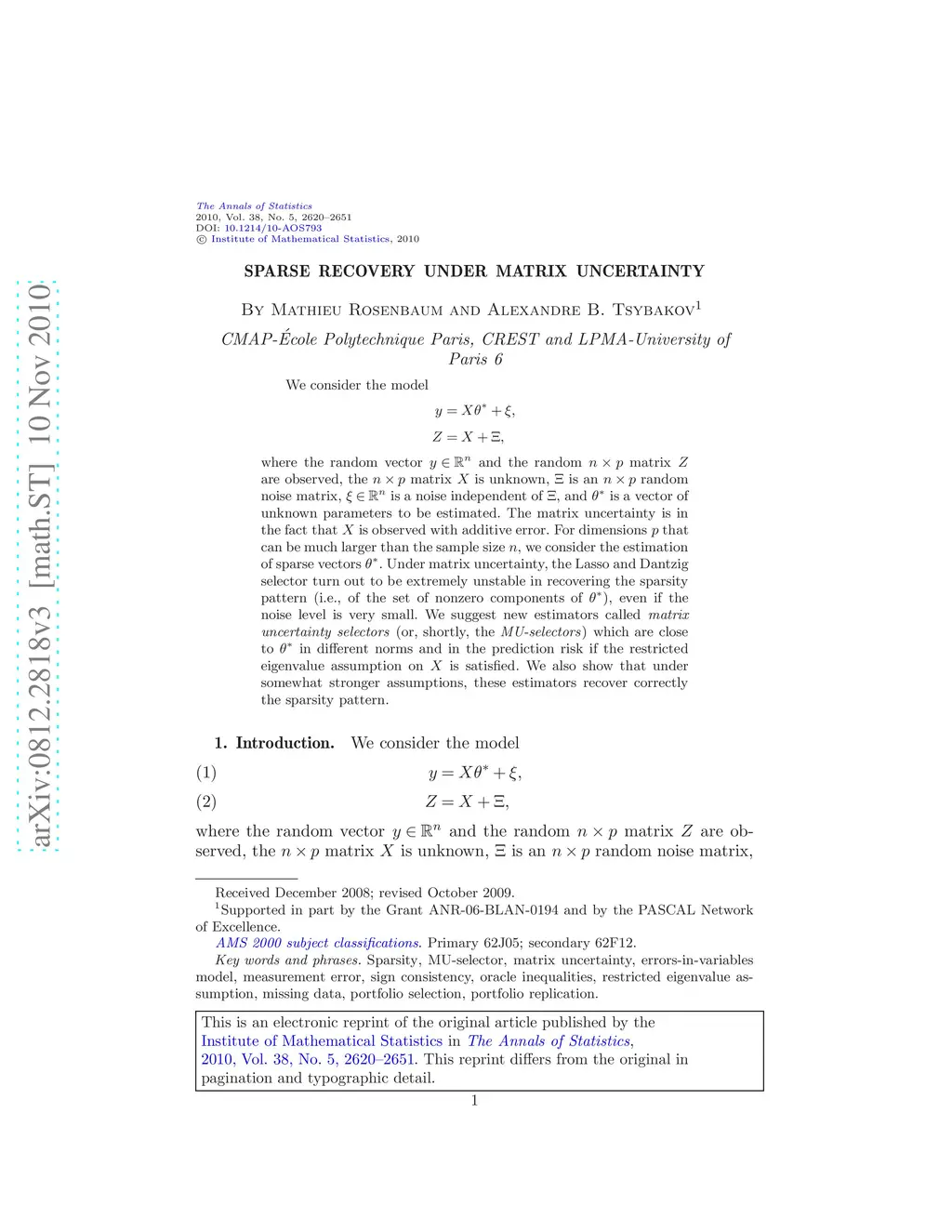 We consider the model {eqnarray*}y=X\theta^*+\xi, Z=X+\Xi,{eqnarray*} where the random vector and the random matrix are observed, the matrix is unknown, is an random noise matrix, is a noise independent of , and is a vector of unknown parameters to be estimated. The matrix uncertainty is in the fact that is observed with additive error. For dimensions that can be much larger than the sample size , we consider the estimation of sparse vectors . Under matrix uncertainty, the Lasso and Dantzig selector turn out to be extremely unstable in recovering the sparsity pattern (i.e., of the set of nonzero components of ), even if the noise level is very small. We suggest new estimators called matrix uncertainty selectors (or, shortly, the MU-selectors) which are close to in different norms and in the prediction risk if the restricted eigenvalue assumption on is satisfied. We also show that under somewhat stronger assumptions, these estimators recover correctly the sparsity pattern.