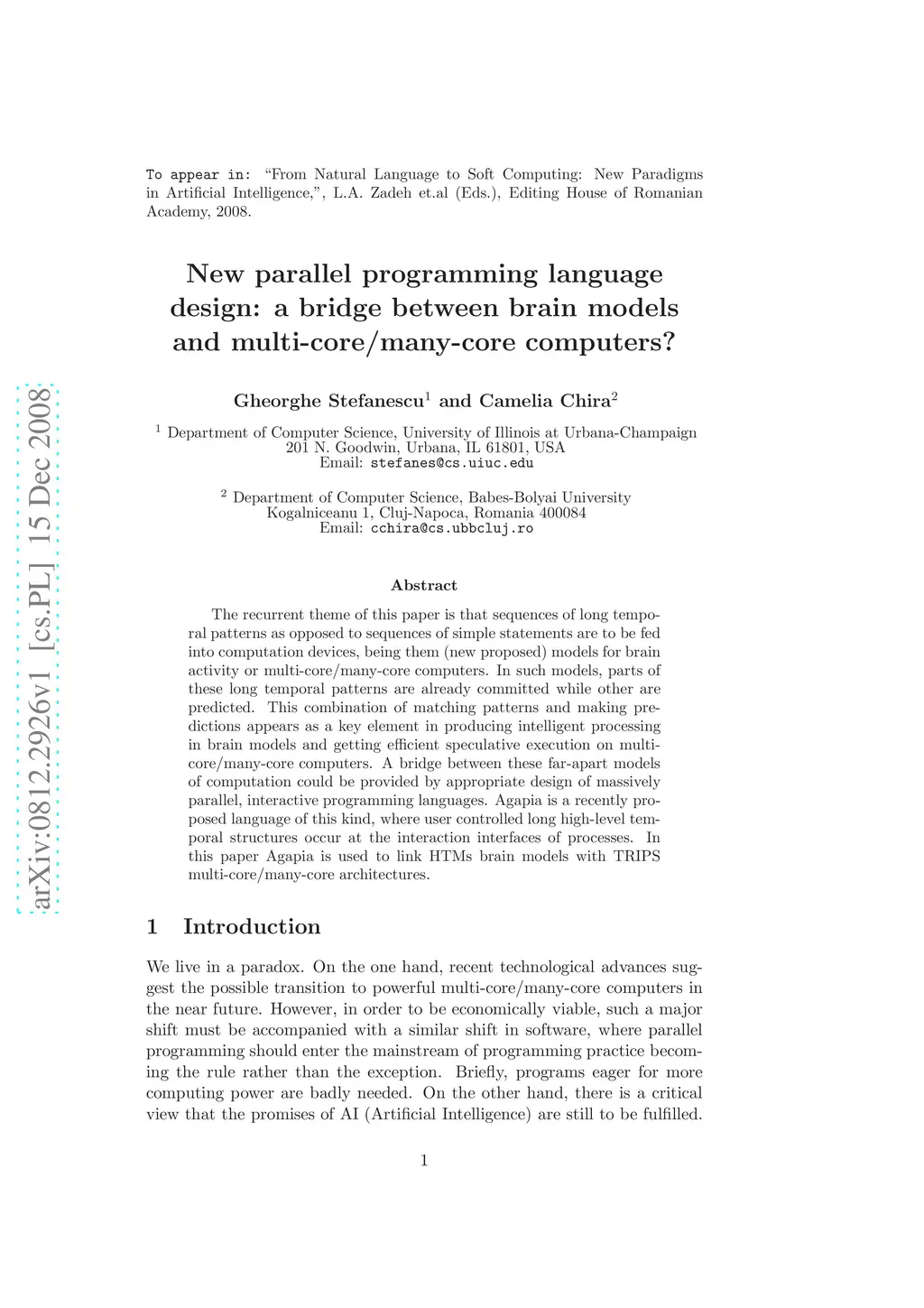The recurrent theme of this paper is that sequences of long temporal patterns as opposed to sequences of simple statements are to be fed into computation devices, being them (new proposed) models for brain activity or multi-core/many-core computers. In such models, parts of these long temporal patterns are already committed while other are predicted. This combination of matching patterns and making predictions appears as a key element in producing intelligent processing in brain models and getting efficient speculative execution on multi-core/many-core computers. A bridge between these far-apart models of computation could be provided by appropriate design of massively parallel, interactive programming languages. Agapia is a recently proposed language of this kind, where user controlled long high-level temporal structures occur at the interaction interfaces of processes. In this paper Agapia is used to link HTMs brain models with TRIPS multi-core/many-core architectures.