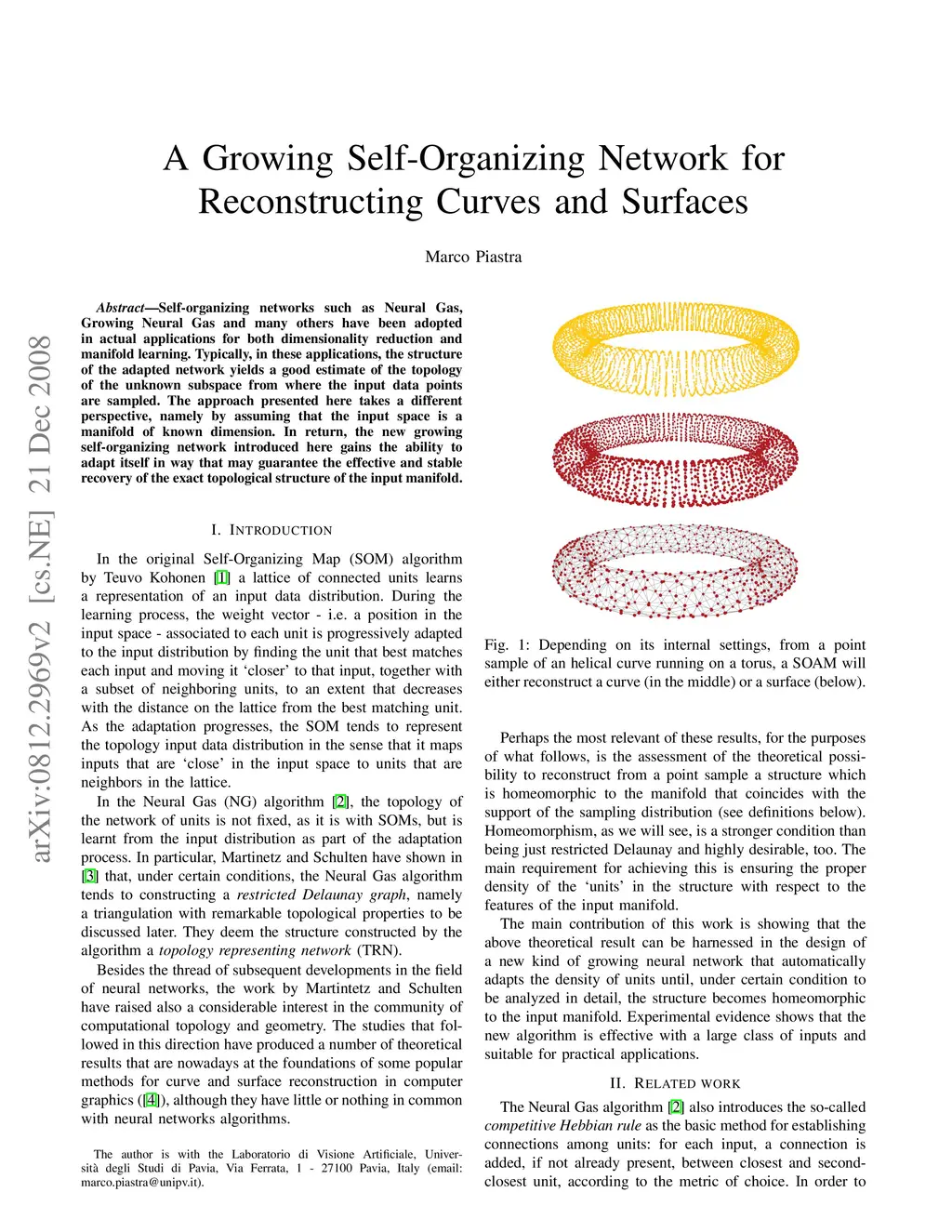 A Growing Self-Organizing Network for Reconstructing Curves and Surfaces