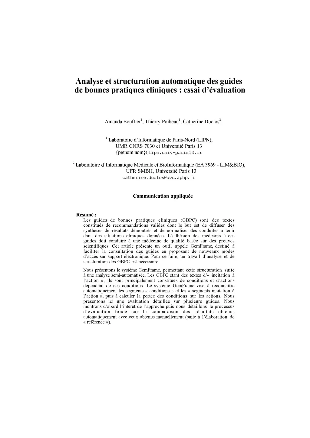 Health Practice Guideliens are supposed to unify practices and propose recommendations to physicians. This paper describes GemFrame, a system capable of semi-automatically filling an XML template from free texts in the clinical domain. The XML template includes semantic information not explicitly encoded in the text (pairs of conditions and ac-tions/recommendations). Therefore, there is a need to compute the exact scope of condi-tions over text sequences expressing the re-quired actions. We present a system developped for this task. We show that it yields good performance when applied to the analysis of French practice guidelines. We conclude with a precise evaluation of the tool.