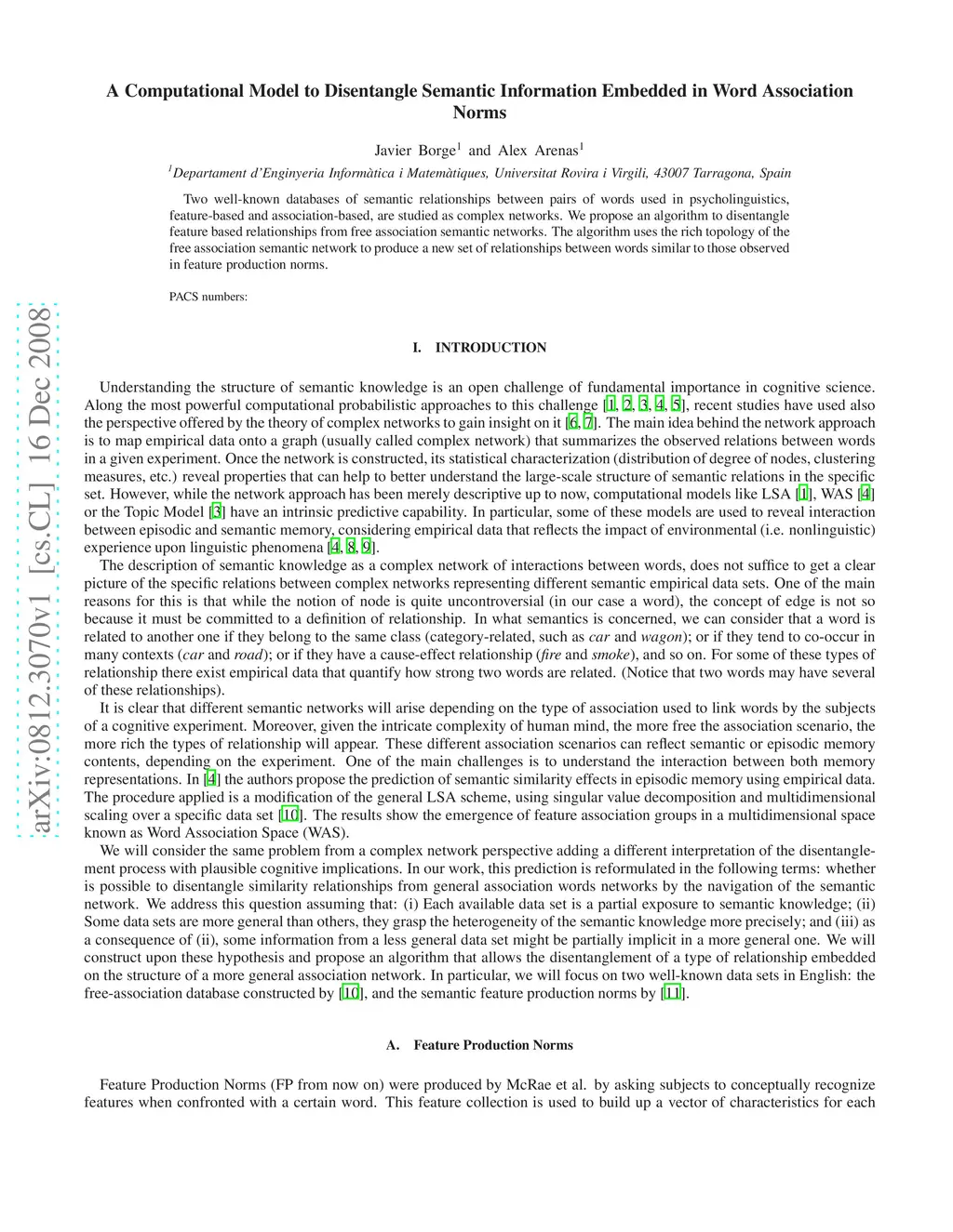Two well-known databases of semantic relationships between pairs of words used in psycholinguistics, feature-based and association-based, are studied as complex networks. We propose an algorithm to disentangle feature based relationships from free association semantic networks. The algorithm uses the rich topology of the free association semantic network to produce a new set of relationships between words similar to those observed in feature production norms.