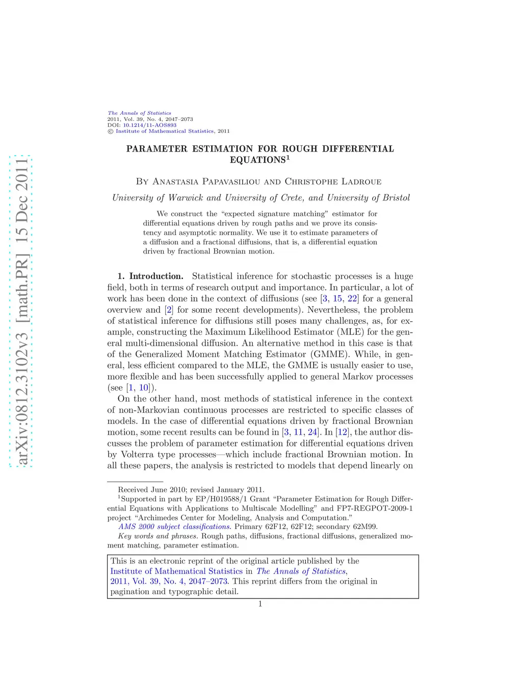 We construct the "expected signature matching" estimator for differential equations driven by rough paths and we prove its consistency and asymptotic normality. We use it to estimate parameters of a diffusion and a fractional diffusions, that is, a differential equation driven by fractional Brownian motion.