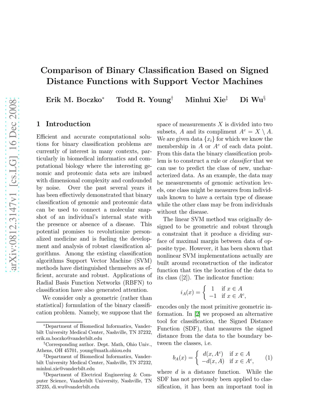 We investigate the performance of a simple signed distance function (SDF) based method by direct comparison with standard SVM packages, as well as K-nearest neighbor and RBFN methods. We present experimental results comparing the SDF approach with other classifiers on both synthetic geometric problems and five benchmark clinical microarray data sets. On both geometric problems and microarray data sets, the non-optimized SDF based classifiers perform just as well or slightly better than well-developed, standard SVM methods. These results demonstrate the potential accuracy of SDF-based methods on some types of problems.